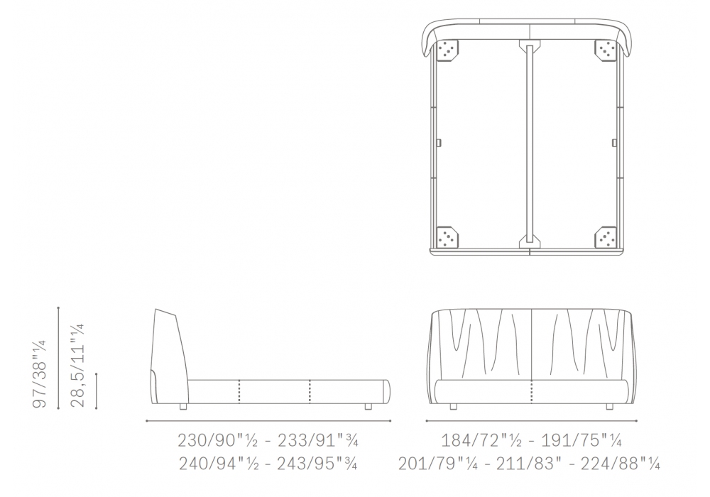 | Dimensions | 191 x 230 x H 97 cm; 191 x 240 x H 97 cm; 201 x 230 x H 97 cm; 201 x 240 x H 97 cm; 211 x 230 x H 97 cm; 211 x 240 x H 97 cm; 184 x 233 x H 97 cm; 224 x 233 x H 97 cm; 209 x 225 x H 97 cm. |