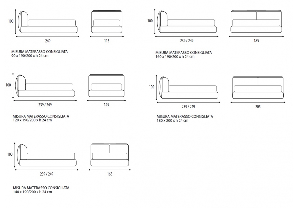 | Dimensions matelas | 90 x 190 cm; 90 x 200 cm; 120 x 190 cm; 120 x 200 cm; 140 x 190 cm; 140 x 200 cm; 160 x 190 cm; 160 x 200 cm; 180 x 200 cm |