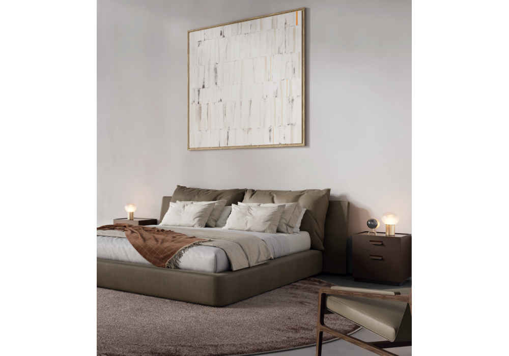 Timeo conçu par Angelettiruzza pour Alivar est un lit revêtu de différents tissus ou cuirs. Cadre de lit et coussins de tête de lit amovibles.