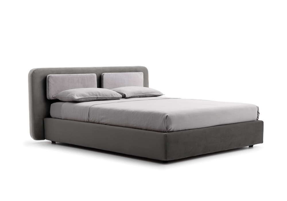 Echo conçu par Kico est un lit avec des coussins rembourrés apparents à la tête de lit et un cadre composé d'une structure rembourrée en tissu ou en cuir. Il peut être équipé de différents types de pieds.