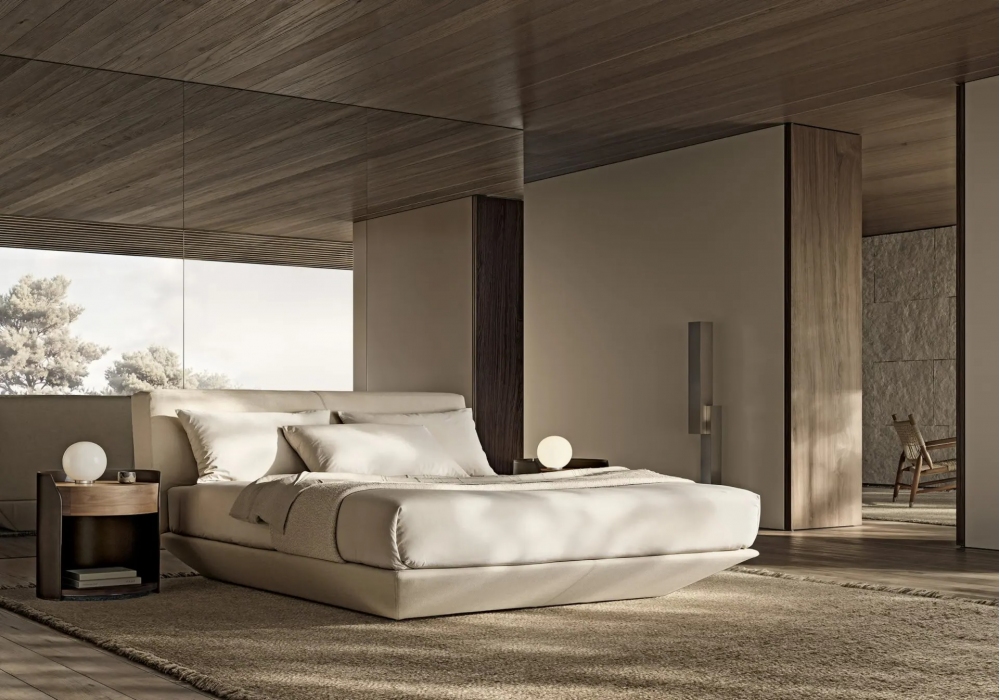 Loungescape conçu par Antonio Citterio pour Flexform est un lit avec structure en bois rembourrée en mousse de polyuréthane et revêtue d’un tissu de protection laminé. Tête de lit en métal et bois avec rembourrage en mousse de polyuréthane à densité variable, revêtue d’un tissu de protection laminé. Structure en métal avec lattes en bois. Pieds en matériau thermoplastique. Revêtement en tissu ou cuir. Disponible en différentes dimensions.