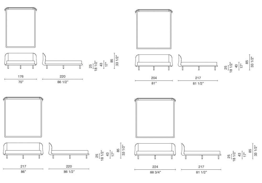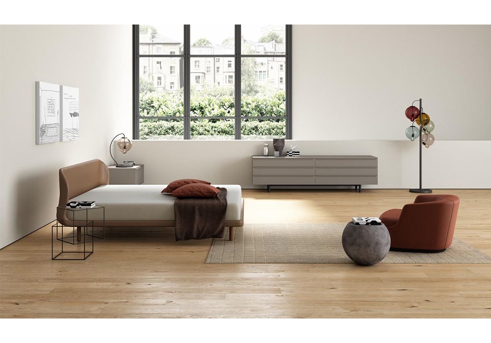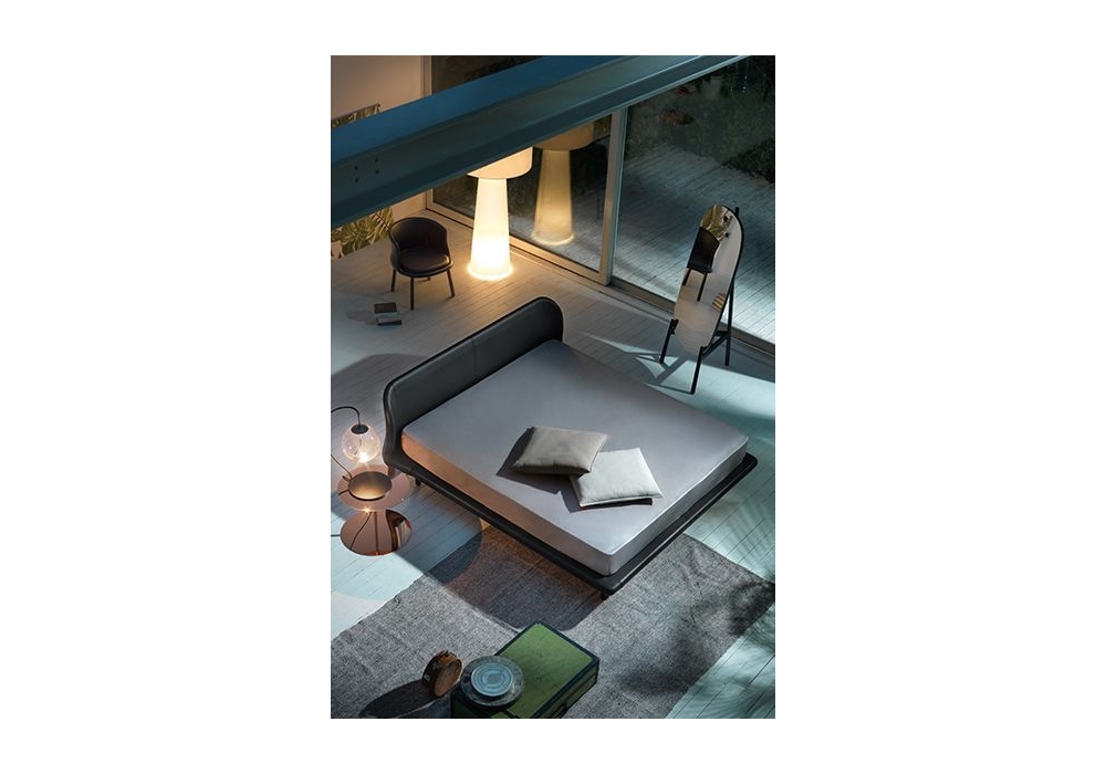 Peg Bed conçu par Nendo pour Cappellini est un lit réalisé avec structure en métal et bois, sommier à lattes et tête de lit rembourrée. Revêtement fixe en tissu ou en cuir. Disponible en différentes finitions et dimensions.