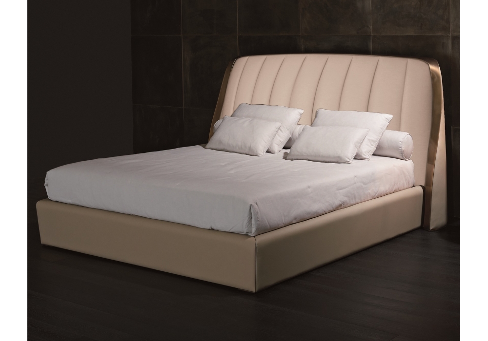 Dama conçu par Rugiano est un lit rembourré en cuir ou en tissu en différentes finitions. Disponible en différentes tailles. Détails en laiton bronzé. Matelas non inclus.