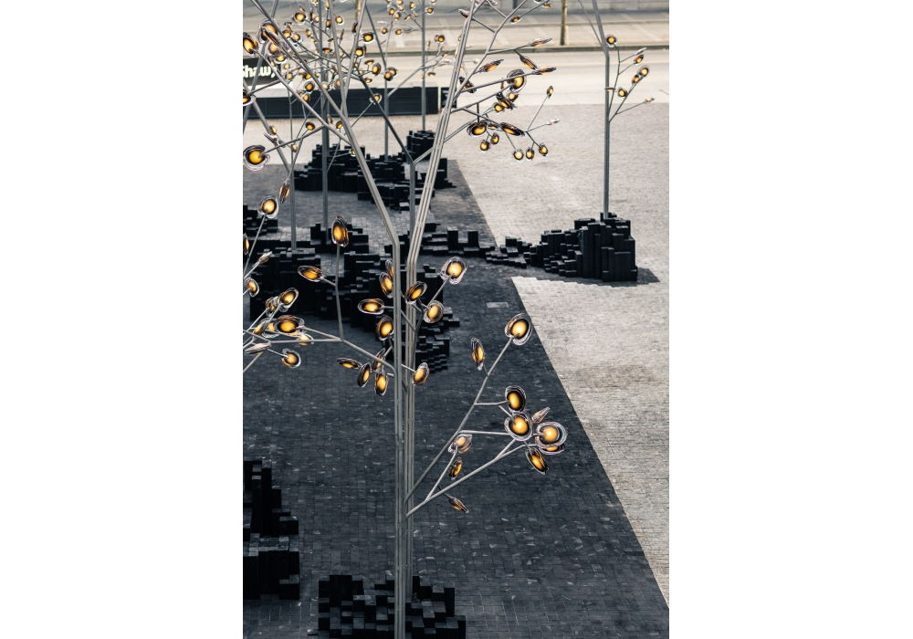 16.25 Elm de la série 16 conçue par Omer Arbel pour Bocci est une lampe d'extérieur. Une installation arborescente à quinze diffuseurs, structure modulaire en inox sur laquelle se greffent des branches reproduisant l'aspect de l'orme. Le tronc a une hauteur de 4,5 mètres, 7 branches et 25 feuilles. Les feuilles sont disponibles en 4 finitions différentes.