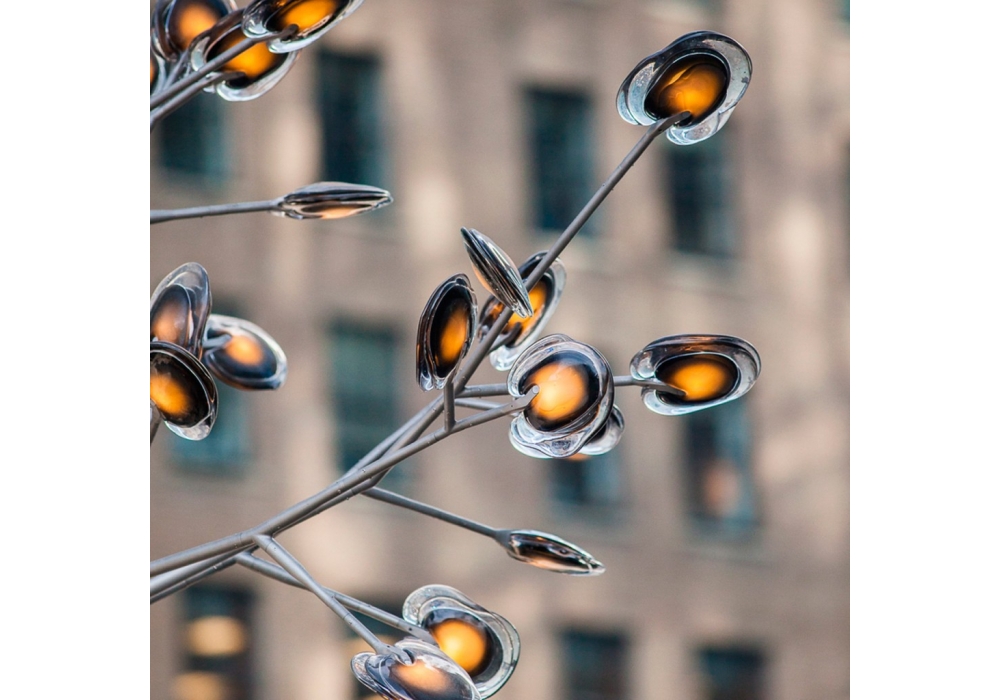 16.35 Aspen de la série 16 conçue par Omer Arbel pour Bocci est une lampe d'extérieur. Une installation arborescente avec trente-cinq diffuseurs, structure modulaire en acier inoxydable sur laquelle viennent se greffer des branches reproduisant l'aspect du peuplier. Le tronc a une hauteur de 7 mètres, 7 branches et 35 feuilles. Les feuilles sont disponibles en 4 finitions différentes.