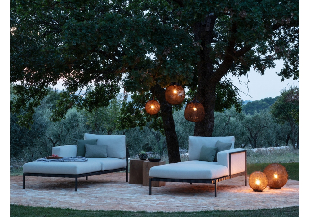Madame Cachet conçue par Ilia Eckardt pour Tribù est une lampe de suspension d'extérieur avec revêtement amovible en polypropylène, disponible en différentes couleurs et dimensions. Éclairage LED. Disponible aussi une lampe de sol dans la même collection.