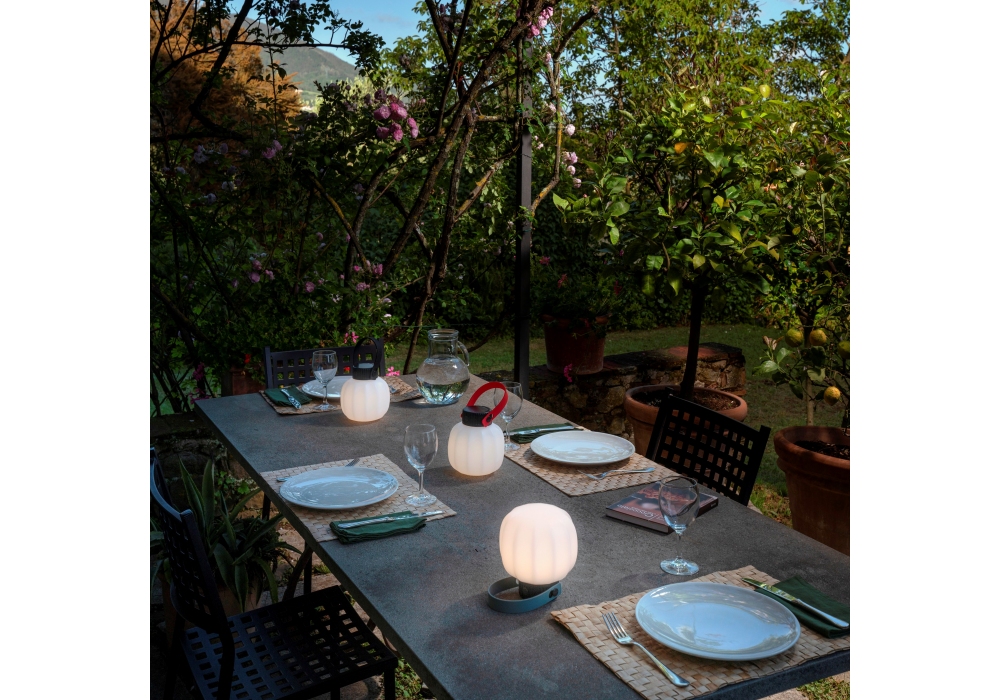 Kiki Cordless conçue par Paola Navone pour Martinelli Luce est une lampe portable pour l'extérieur avec structure en polyéthylène et poignée en silicone. La source lumineuse retenue est de type LED dimmable intégrée. Kiki est disponible avec poignée en différentes finitions et avec ou sans chargeur.