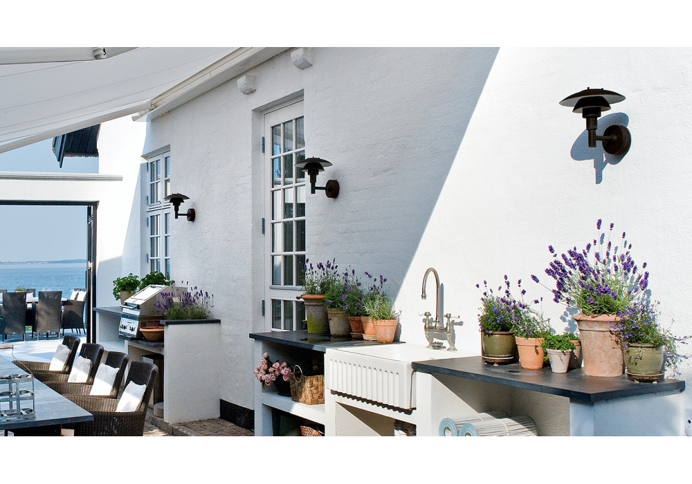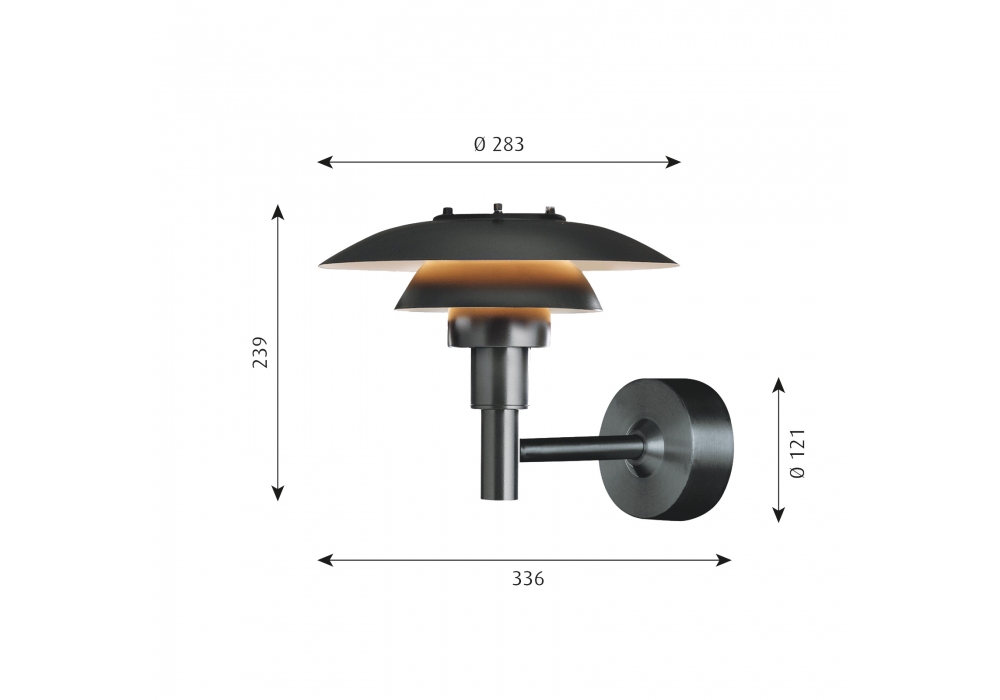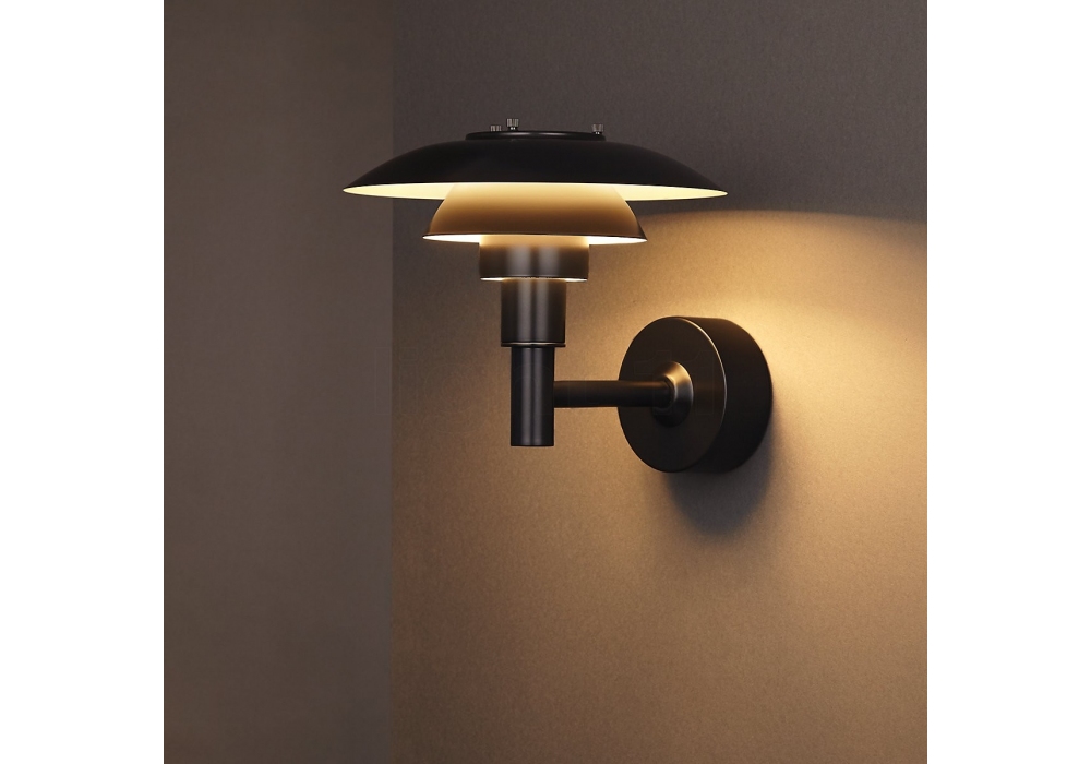 PH 3-2½ conçue par Poul Henningsen pour Louis Poulsen est une applique d'extérieur avec structure portante en acier inoxydable étiré électrostatique peint en noir. Le diffuseur est en verre moulé et protège une source lumineuse LED ou halogène avec culot E27.