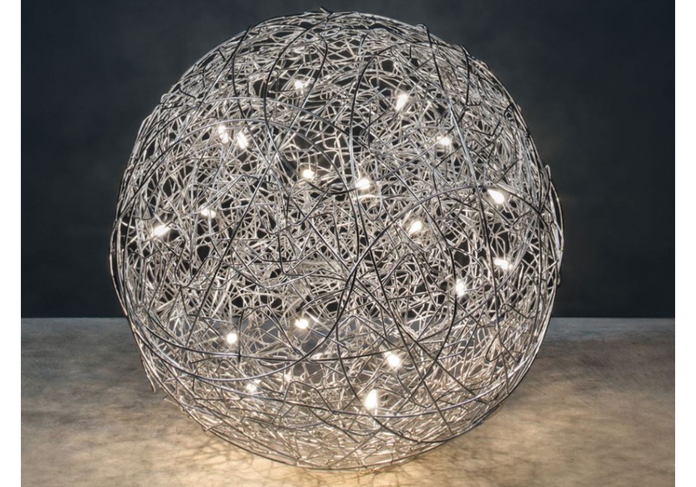 Fil de Fer F conçu par Enzo Catellani pour Catellani & Smith est un lampadaire LED d'extérieur, en fil d'aluminium naturel moulé et tissé, éclairé à l'intérieur grâce à la présence de minuscules ampoules. Le transformateur est recouvert de résine IP67 et logé dans un boîtier noir. Disponible en différentes tailles.