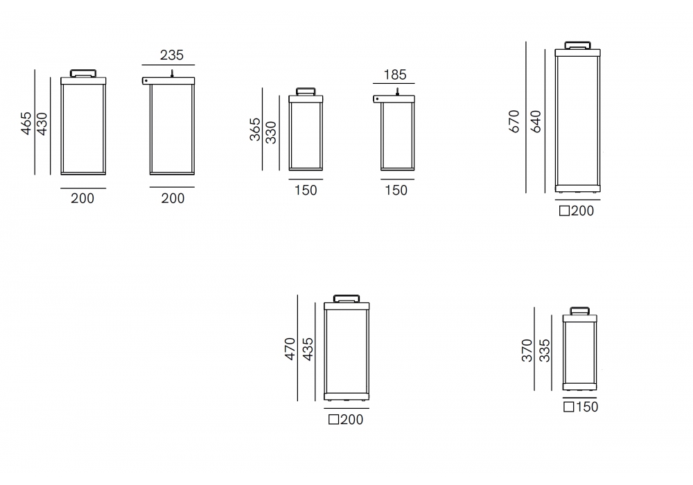 | Dimensions | 15 x 15 x H 37 cm; 20 x 20 x H 47 cm; 20 x 20 x H 67 cm; 15 x 15 x H 36,5 cm; 20 x 20 x H 46,5 cm. |