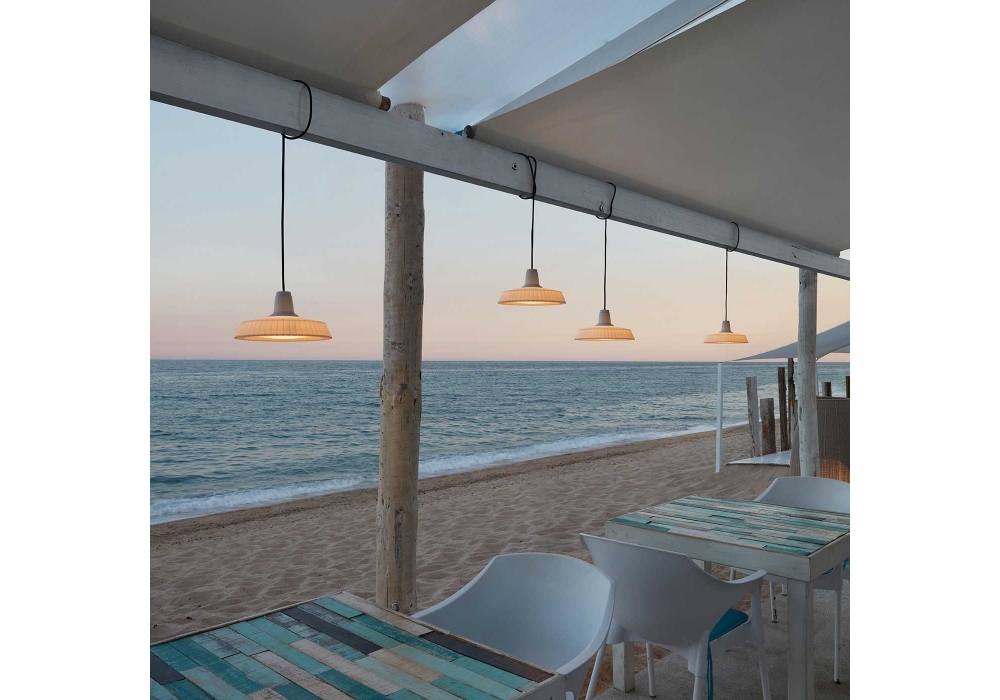 Marietta conçue par Joana Bover pour Bover est une lampe à suspension d'extérieur avec structure portante en aluminium peint. Le diffuseur est circulaire en polyéthylène blanc de moyenne densité et abrite une source lumineuse de type LED avec un système de variateur triac.