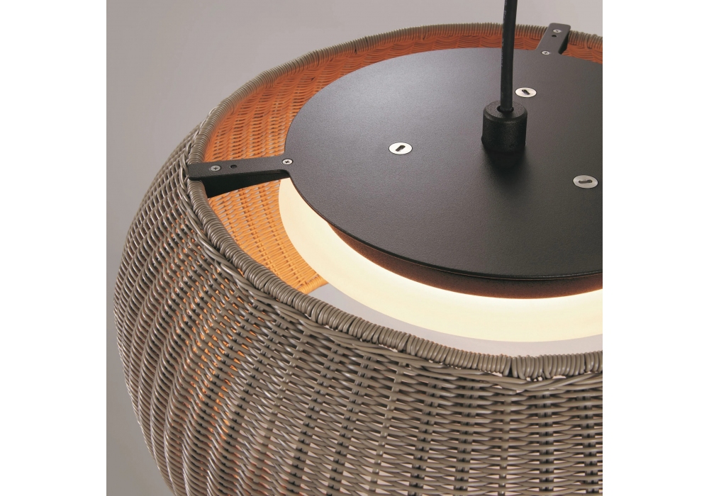 Perris conçue par Joana Bover pour Bover est une suspension d'extérieur avec structure portante en acier inoxydable et aluminium peint en marron. L'abat-jour est de forme circulaire en fibre synthétique avec diffuseur en polycarbonate et abrite une source de lumière LED avec système de variateur Triac. Perris Sphere est disponible en différentes finitions d'abat-jour.