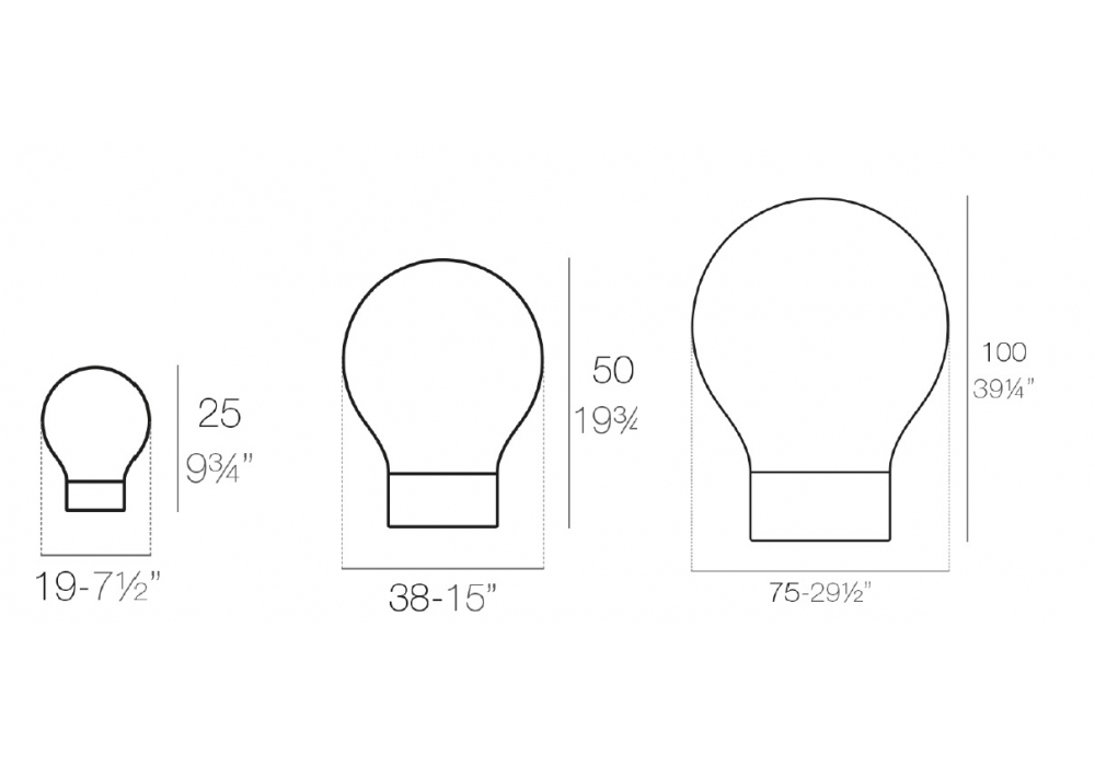 | Dimensions | Ø 19 x H 25 cm; Ø 38 x H 50 cm; Ø 75 x H 100 cm. |