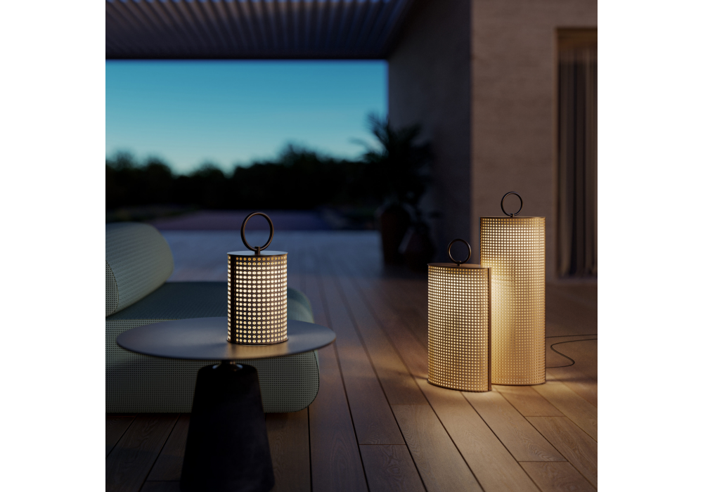 Clara conçue par Chiara Caberlon pour Contardi est une lampe d'extérieur dotée d'un diffuseur en résine effet paille de Vienne et d'une structure crème ou bronze. Résistante aux intempéries et aux UV, elle est fournie avec un câble noir muni d'un connecteur extérieur IP68.