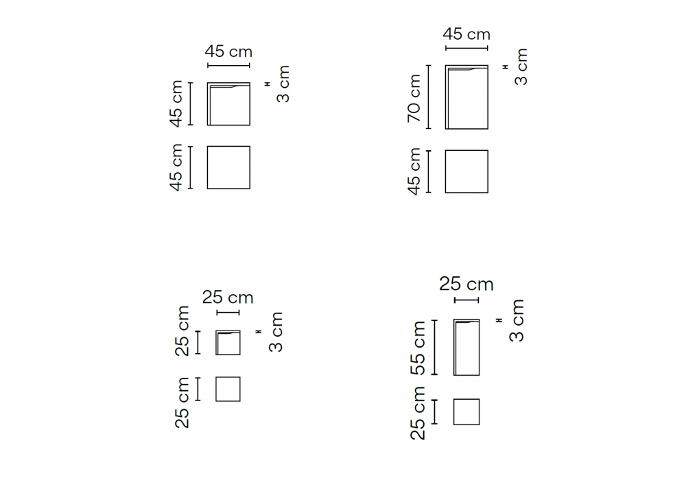 | Dimensions | 45 x 45 x H 3 cm; 70 x 45 x H 3 cm; 25 x 25 x H 3 cm; 55 x 25 x H 3 cm. |
