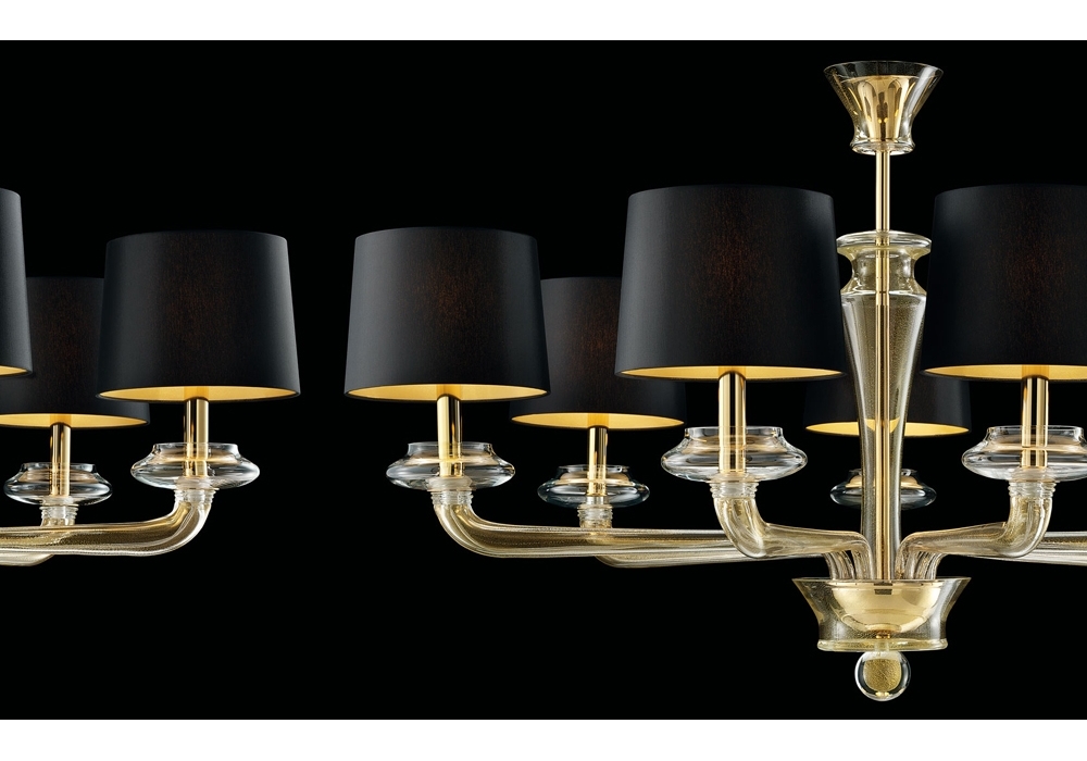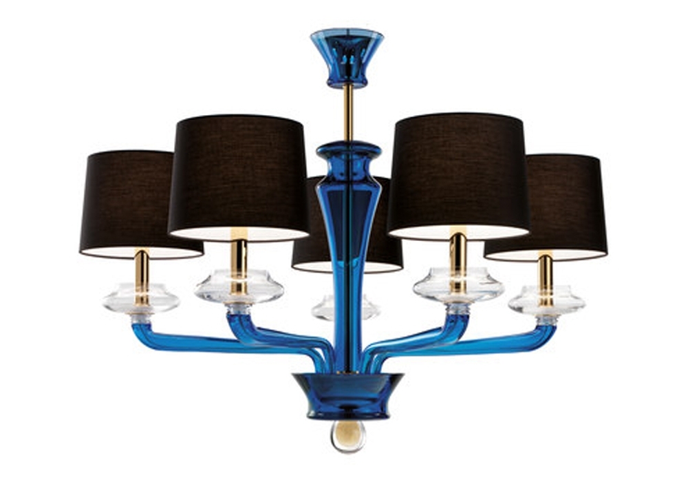 Saint Germain conçu par Giorgia Brusemini pour Barovier & Toso est un lustre avec structure portante en métal recouvert de verre vénitien. Les abat-jour sont en tissu et cachent des sources lumineuses LED ou halogènes dimmables. Saint Germain est disponible en différentes finitions.
