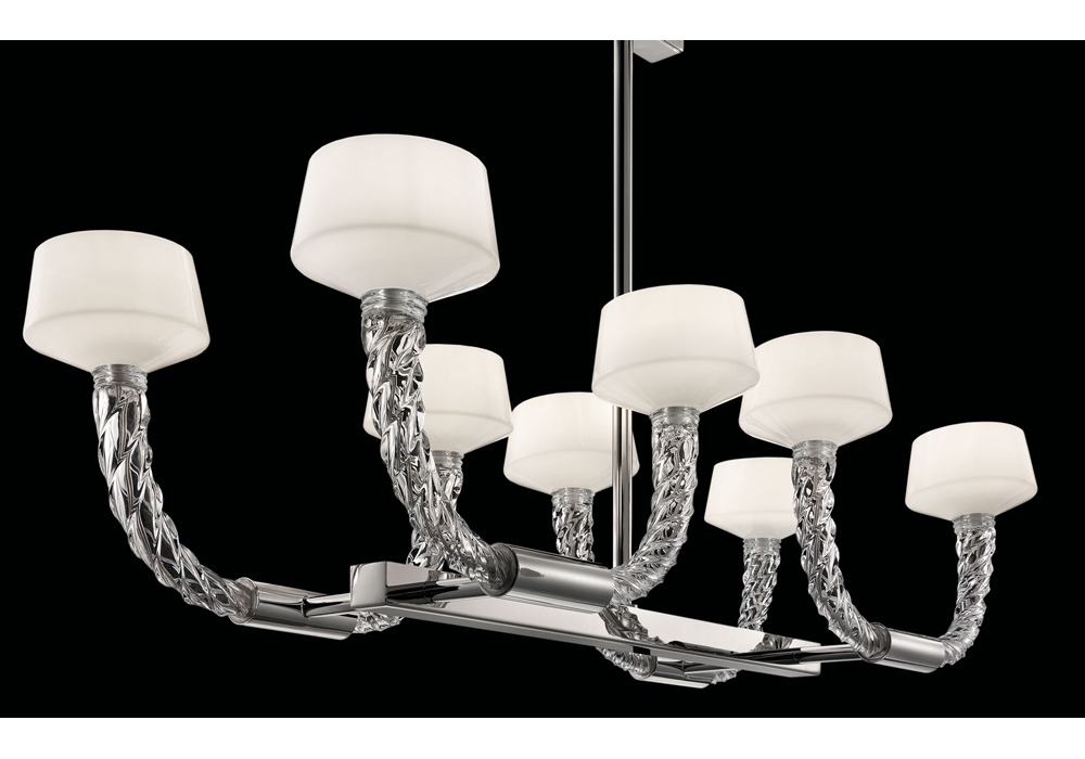 Twins produit et conçu par Barovier & Toso est un lustre avec une structure portante en métal de forme quadrangulaire et des bras recouverts de verre vénitien. Les diffuseurs sont de forme circulaire, également en verre vénitien blanc et écran LED dimmable ou sources lumineuses halogènes. Twins est disponible en différents modèles et finitions.