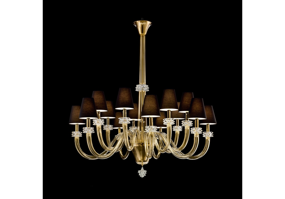 Amsterdam conçu et produit par Barovier & Toso est un lustre structuré à 1 ou plusieurs niveaux superposés avec une structure en métal recouverte de verre vénitien. Les bras supportent des abat-jour en tissu avec des sources lumineuses LED ou halogènes dimmables. Amsterdam est disponible en différents modèles et finitions.