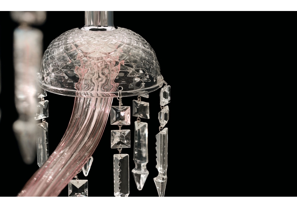Première Dame conçue et produite par Barovier & Toso est un lustre structuré à 1 ou plusieurs niveaux superposés avec structure en métal et bras recouverts de verre vénitien et de cristal. Les bras supportent des abat-jour en tissu qui protègent les sources lumineuses LED ou halogènes à intensité variable. Première Dame est disponible en différents modèles et finitions.
