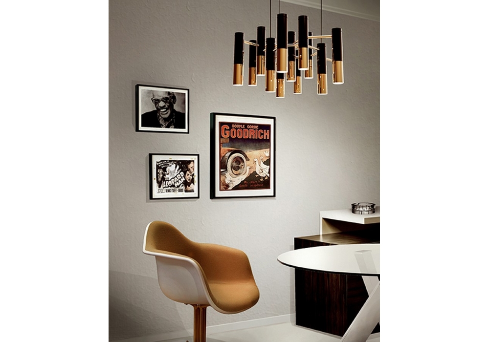 Ike Suspension conçu par DelighFULL est un lustre fabriqué à la main en laiton et aluminium et a une finition noire brillante et plaquée or. Il peut être personnalisé en hauteur. Fortement recommandé pour une utilisation avec un gradateur pour diffuser une lumière plus uniforme.