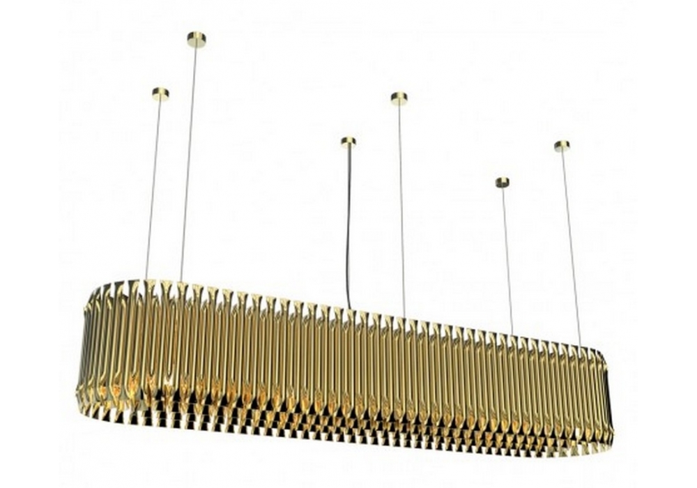 Matheny Snooker conçue par DelightFULL est une lampe à suspension au design géométrique de tubes combinés et sa structure est faite à la main en laiton.
