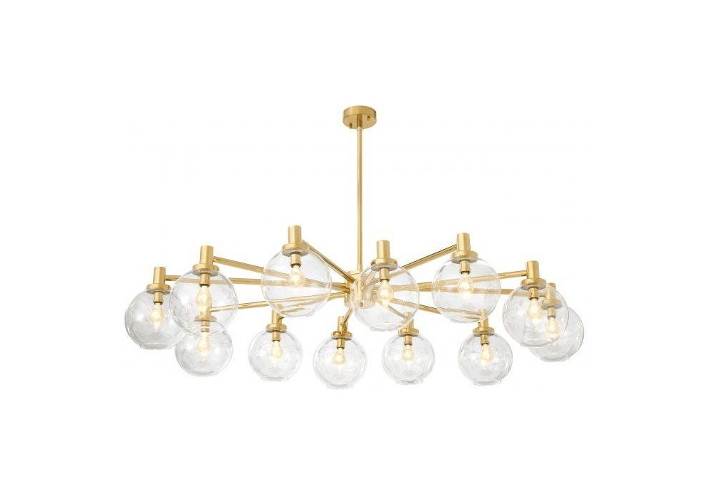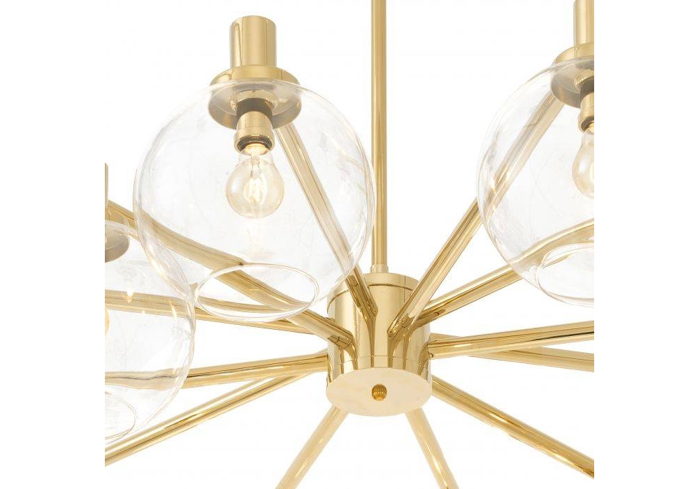 Selva conçu par Eichholtz est un lustre réalisé avec une structure finition or et des abat-jours en verre transparent.