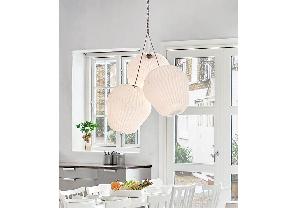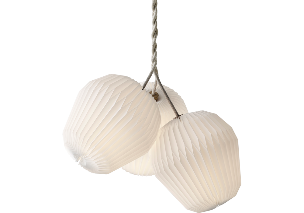 Le Bouquet Chandelier conçu par Sinja Svarrer pour Le Klint est une lampe à suspension structurée par l'association du plastique et du bois. les trois grands abat-jour sont en matière plastique ou papier avec une surface aux plis réguliers et précis pour assurer une diffusion optimale de la lumière. Le boîtier de la lampe est en bois de chêne et utilise des sources lumineuses LED ou halogènes (non incluses). Le lustre Bouquet est disponible en différentes tailles.