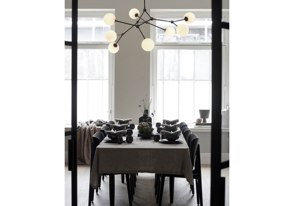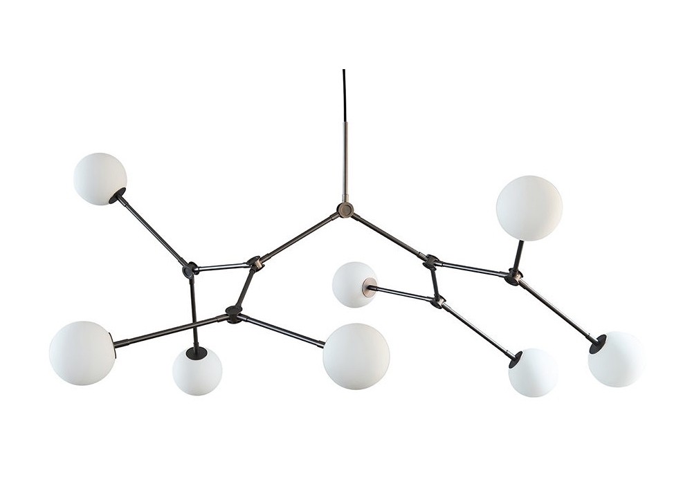 Drop Bulp conçu par Kristian Sofus Hansen & Tommy Hyldahl pour 101 Copenhagen est un lustre en métal avec une finition grise et des abat-jour en verre opale.