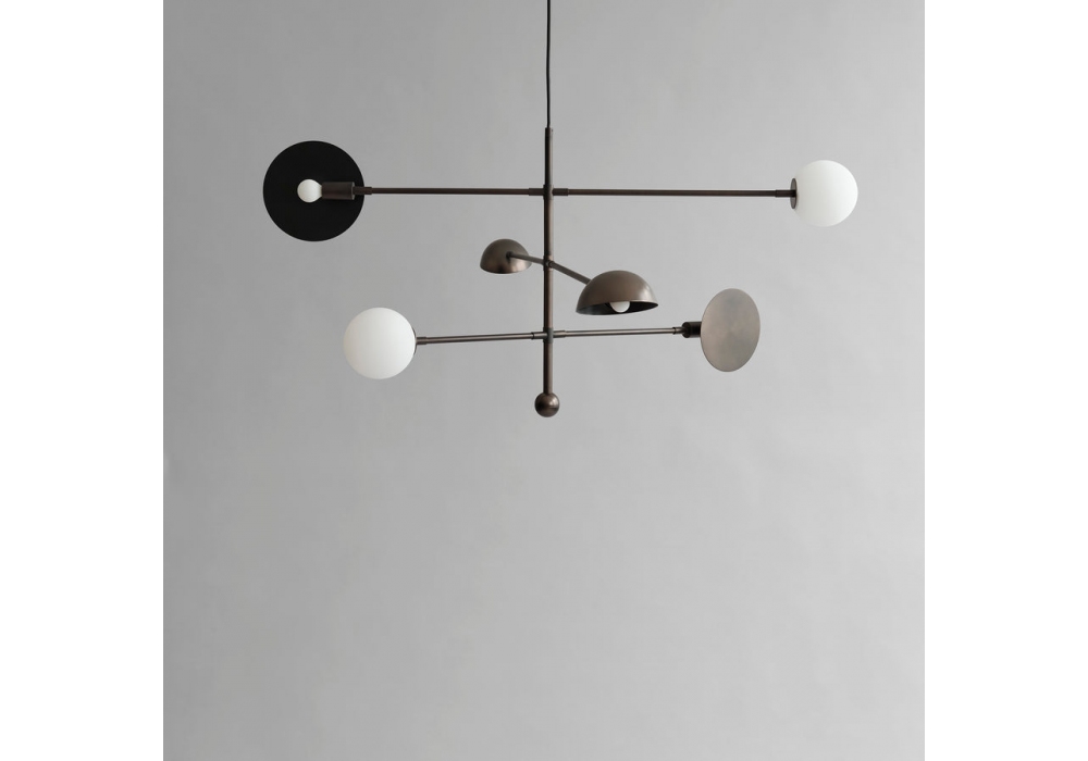 Sahn conçu par Kristian Sofus Hansen & Tommy Hyldahl pour 101 Copenhagen est un lustre en métal finition bronze et abat-jour en verre opale. Bras et abat-jour tournant dans des directions différentes.
