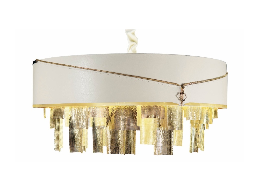Vougue conçu par Andrea Bonini pour Turri est un lustre avec structure en métal et revêtement en différents cuirs avec l'application de détails en métal doré et de fermetures éclair décoratives. Disponible en deux dimensions.