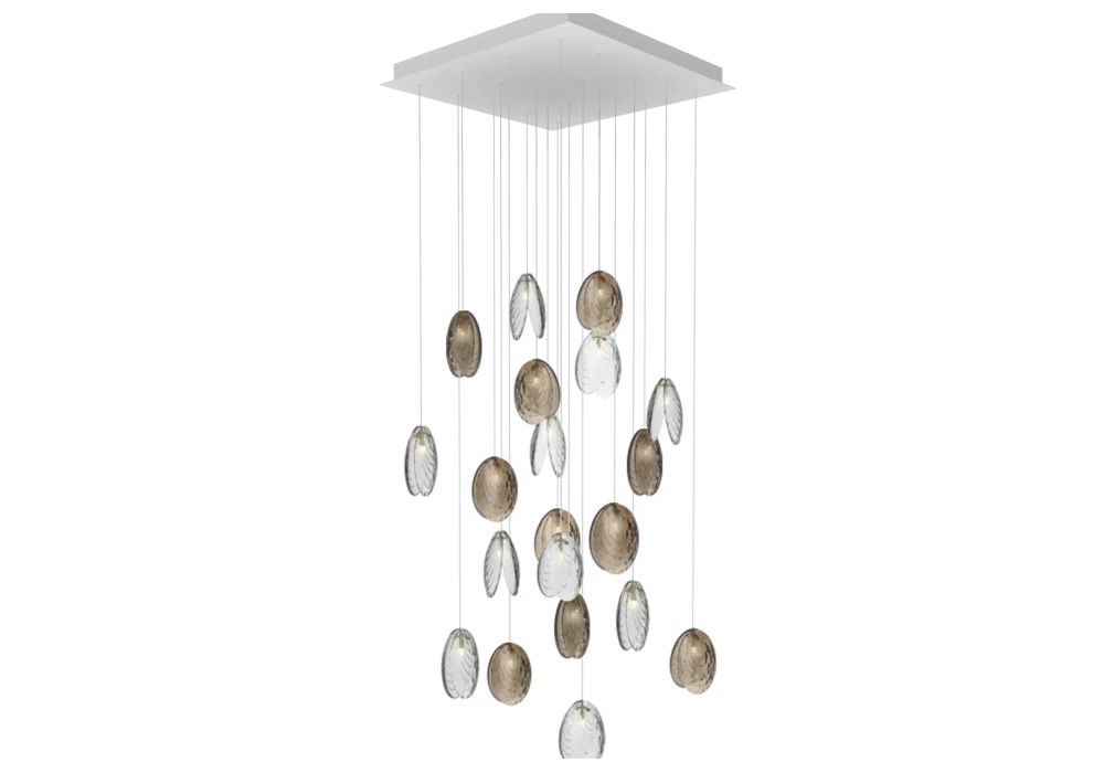 Mussels conçu par Václav Mlynář pour Bomma est un lustre avec diffuseurs en verre pressé peints à la main et monture en métal. Il est disponible en différentes finitions et modèles.