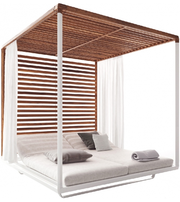 Pavilion conçu par Monica Armani pour Tribù est un lit de jour à baldaquin avec structure en aluminium en différentes finitions, le dossier et le toit sont en teck, aluminium ou lattes Sunvision, un tissu amovible qui filtre les rayons du soleil sans bloquer la lumière. Les rideaux sont transparents et disponibles en différentes couleurs.