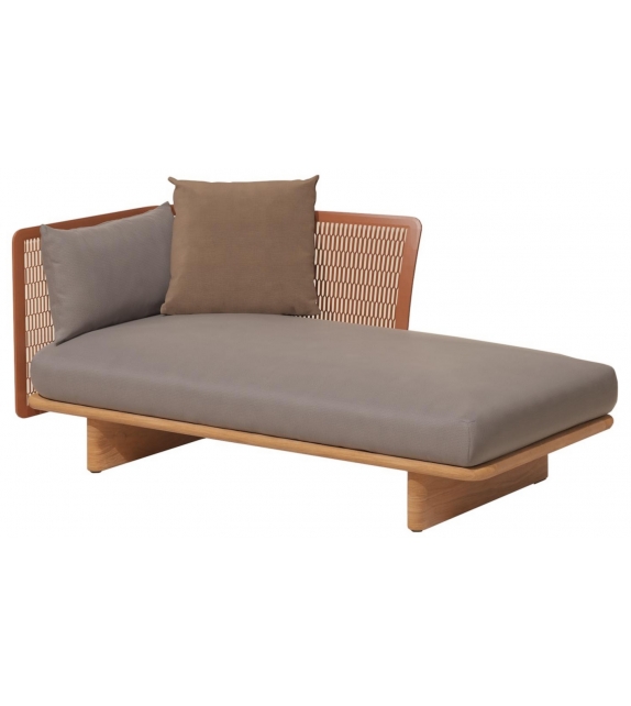 Mesh conçue par Patricia Urquiola pour Kettal est une chaise longue d'extérieur avec une base en bois de teck et une structure en aluminium. Les coussins d'assise et de dossier sont rembourrés et recouverts de tissu disponible en différentes finitions. Mesh est disponible en version d'angle droit ou gauche.