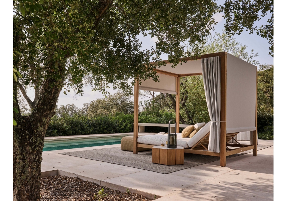Pure conçu par Andrei Munteanu pour Tribù est un canapé-lit d'extérieur avec une structure entièrement en bois de teck enrichie de rideaux latéraux et arrière réglables. Les coussins sont rembourrés et recouverts d'un tissu adapté à une utilisation en extérieur. Pure est disponible en différentes finitions de tissu.