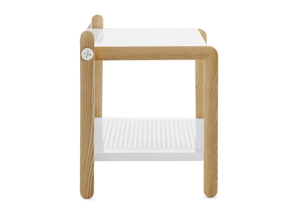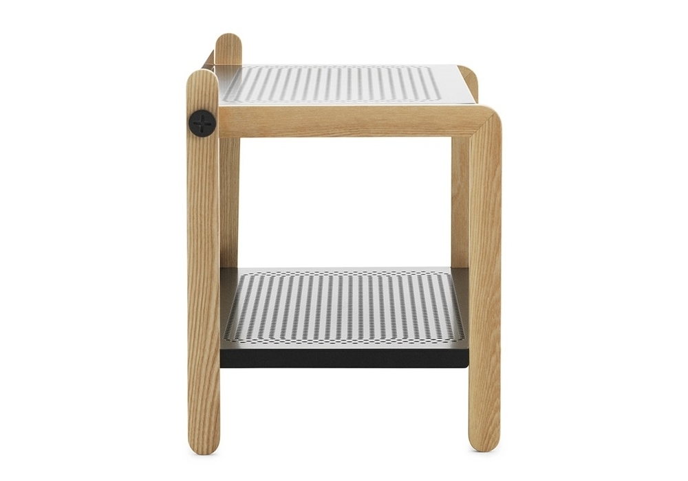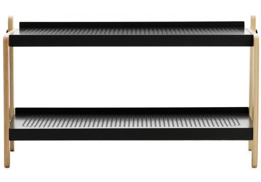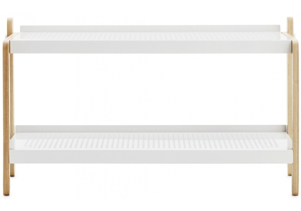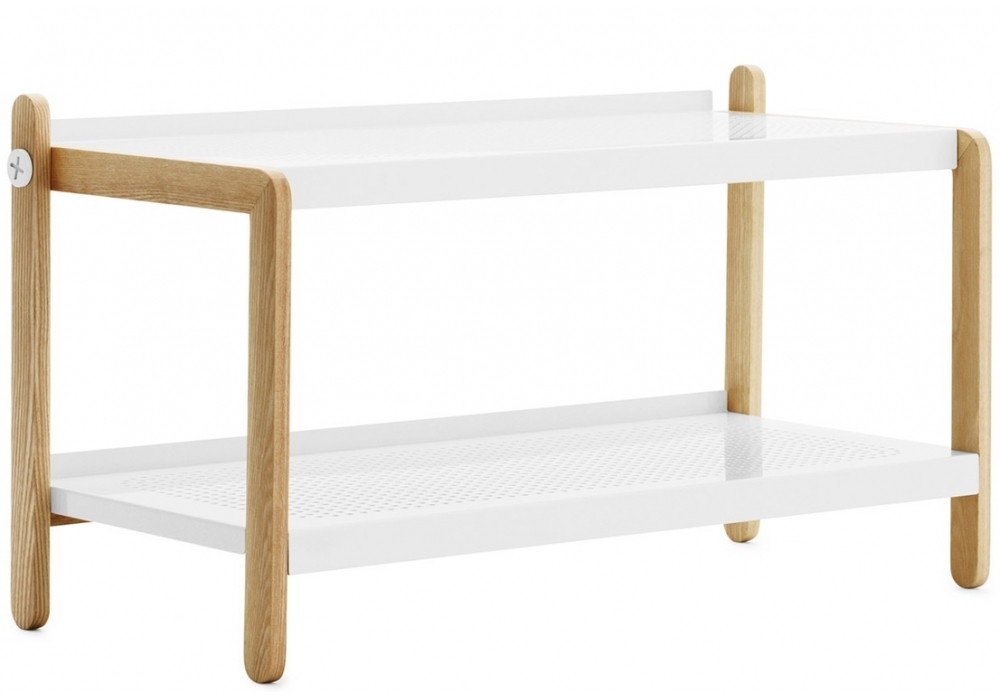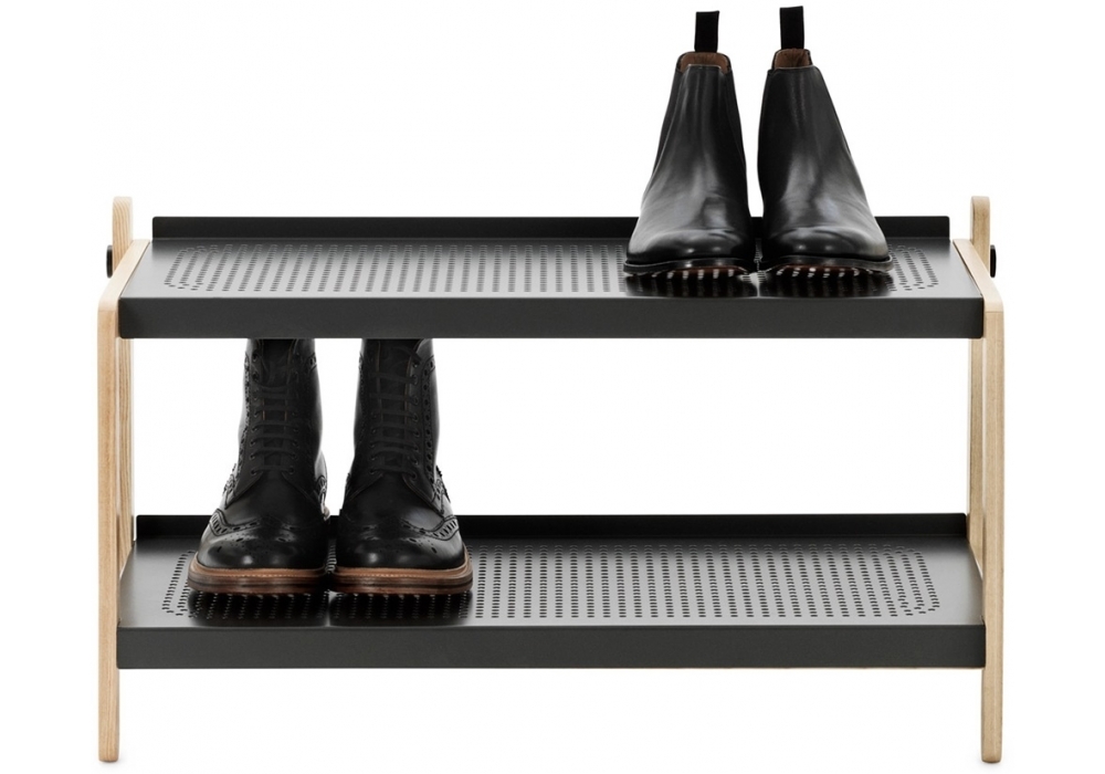 Sko, conçu par Simon Legald pour Normann Copenhagen est un meuble à chaussures composé d'un cadre en bois avec deux étagères en acier perforé. Sko est disponible avec des étagères dans les couleurs ; gris foncé ou blanc pur.