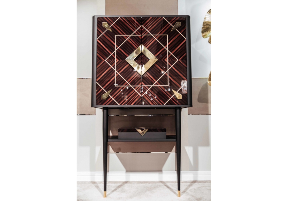 Spirit mobile bar conçu par Vismara Design est un comptoir de bar pour la maison. La base est composée de quatre pieds minces en métal avec des pointes en laiton poli, le meuble est composé de deux portes, poignées et détails en laiton poli, intérieur en bois laqué mat, étagère en verre et dos miroir. Éclairage automatique à l'ouverture des portes.