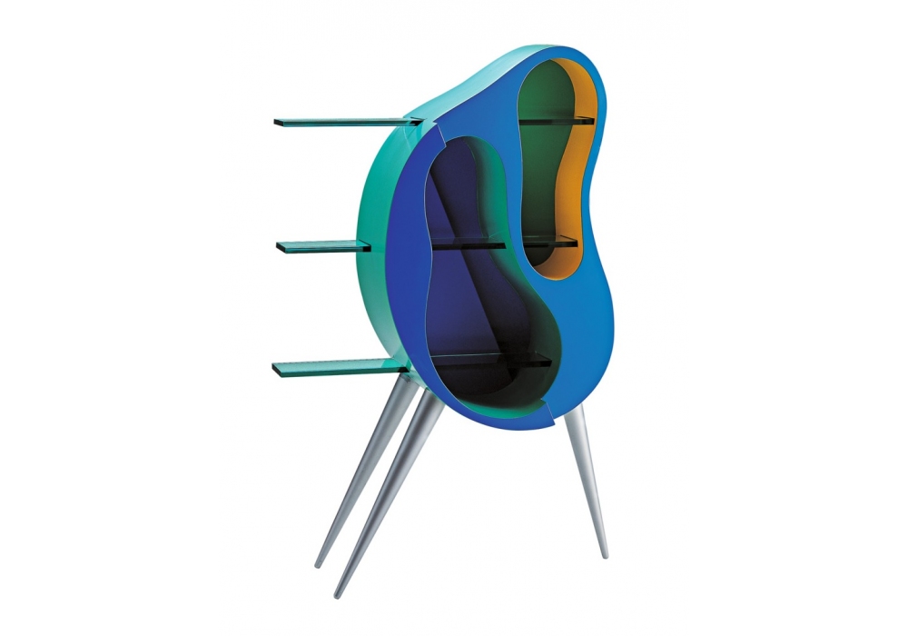 7521 Mikiolone conçu par Alessandro Mendini pour Zanotta Edizioni est un meuble bar avec structure en bois laqué de différentes couleurs, pieds en bois tourné laqué argent et plateaux en verre. Neuf exemplaires signés et numérotés.