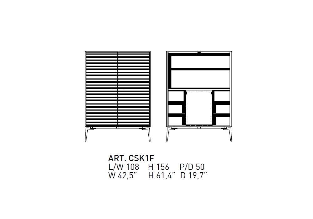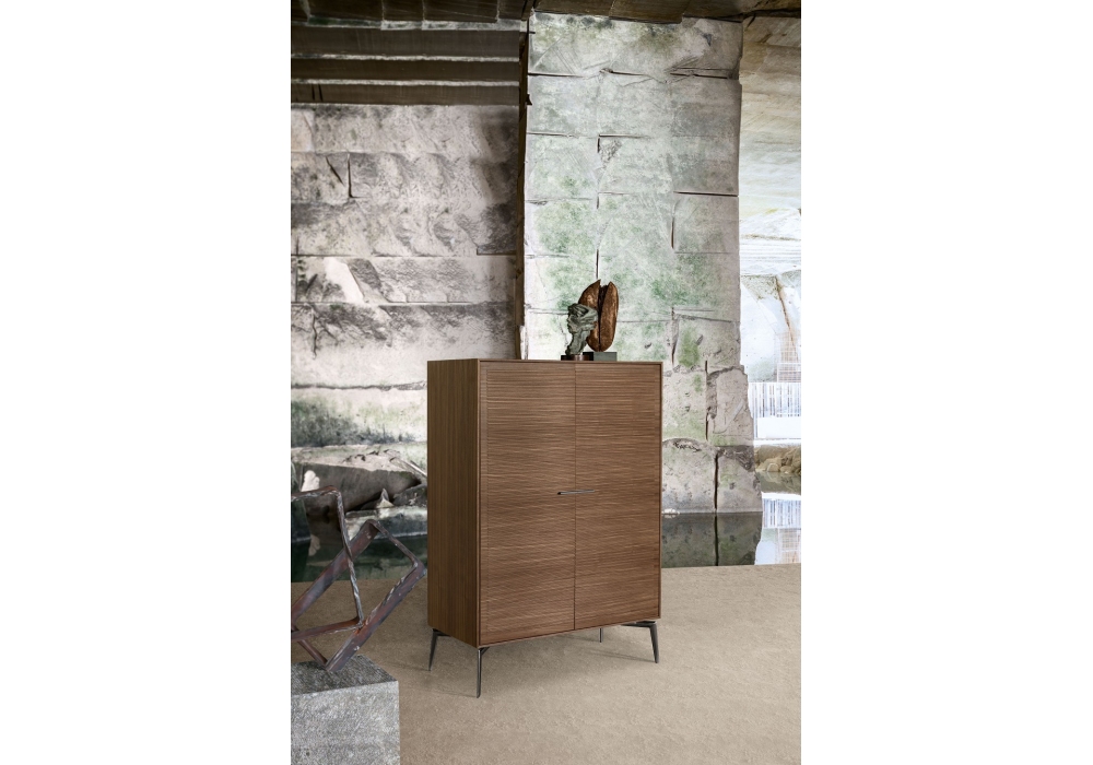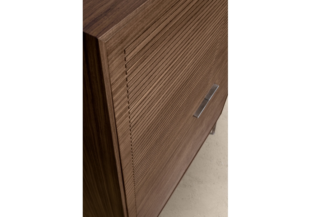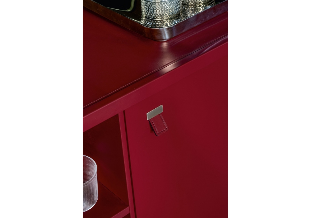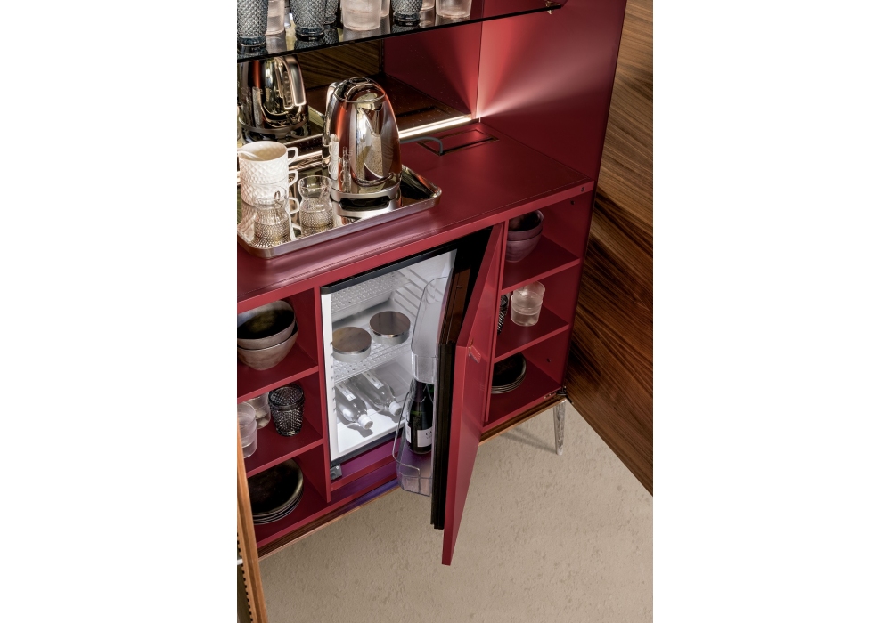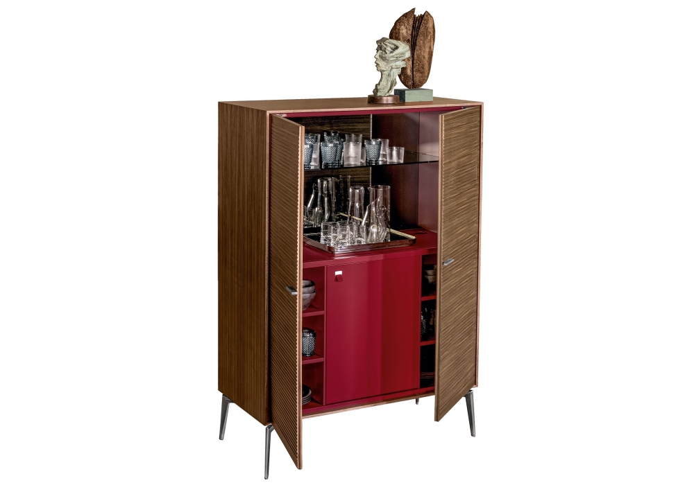 Shake conçu par Giuseppe Bavuso pour Alivar est un meuble bar avec finition extérieure en noyer, portes avec décoration cannelée et intérieur en laqué rouge foncé mat 40.20 ou sable 15.65. Compartiment interne équipé d'un miroir, d'une étagère recouverte de cuir London C05 rouge (en combinaison avec le laquage 40.20) ou de cuir boue C28 (en combinaison avec le laquage 15.65) et d'une étagère supérieure en verre, d'un mini-bar et d'un éclairage LED interne. Capacité du réfrigérateur 35 litres, classe de consommation A +++. Pieds et poignées en fonte d'aluminium poli, laqué ou nickel noir. Dos dans la même finition que le meuble intérieur.