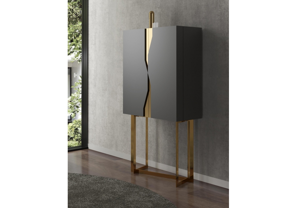 Cruise conçu par Gualter Torres pour Gual Design est un meuble bar avec base et applications en fer peint noir ou en acier inoxydable doré. Structure 2 portes laquée mate avec 2 étagères internes. Disponible en différentes finitions.