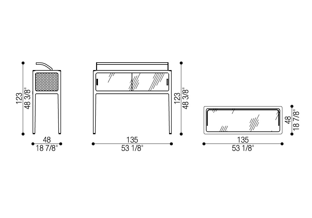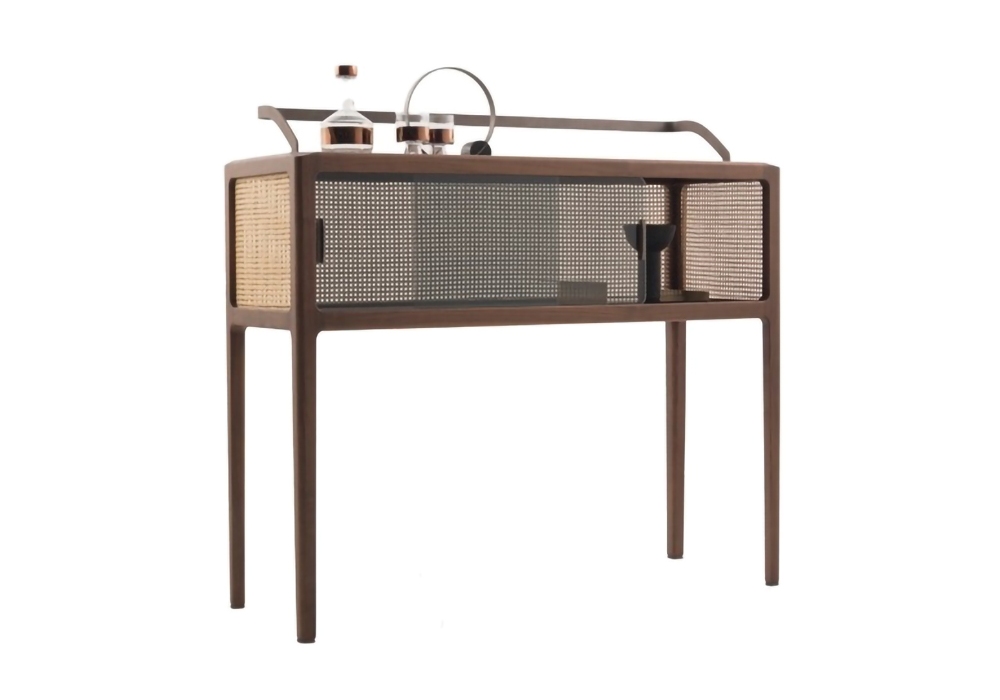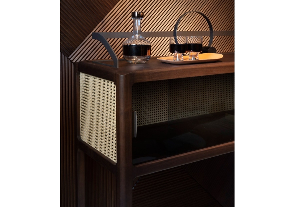 Mastro conçu par Opera Contemporary est un meuble bar réalisé avec structure en noyer Canaletto, portes coulissantes et plateau en verre fumé. Côtés et dos en paille de Vienne naturelle.