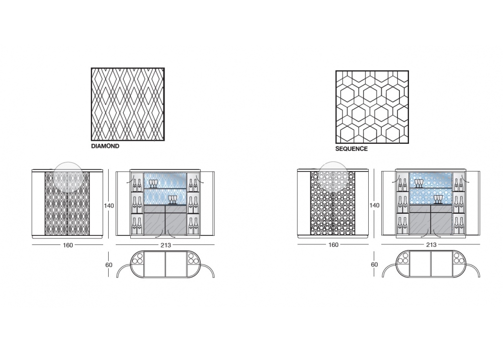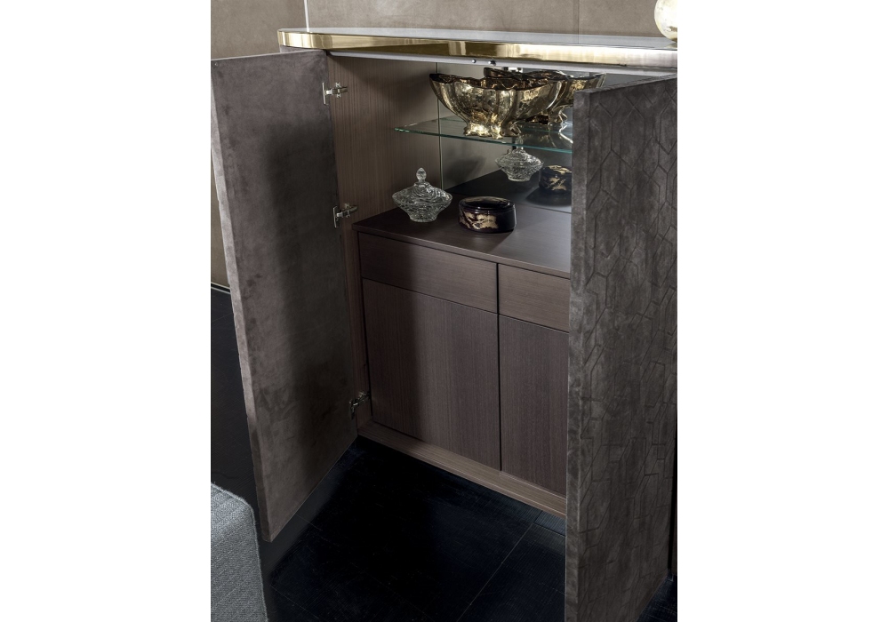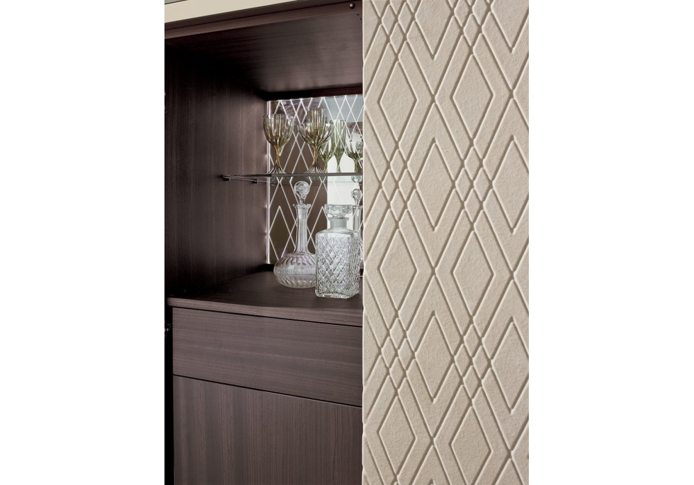 Beverly conçu par Giuseppe Iasparra pour Longhi est un meuble bar recouvert de cuir ou de cachemire. Finition intérieure en bois de zebrano teinté foncé, étagères en verre transparent et deux tiroirs. Dessus en miroir et base et bords en métal rectifié. En accessoire, un mini refroidisseur à vin peut être ajouté. Disponible dans la version avec revêtement lisse ou avec décoration en relief Sequence ou Diamond. Sur demande, il est possible d'ajouter un miroir laser à LED à lumière froide.