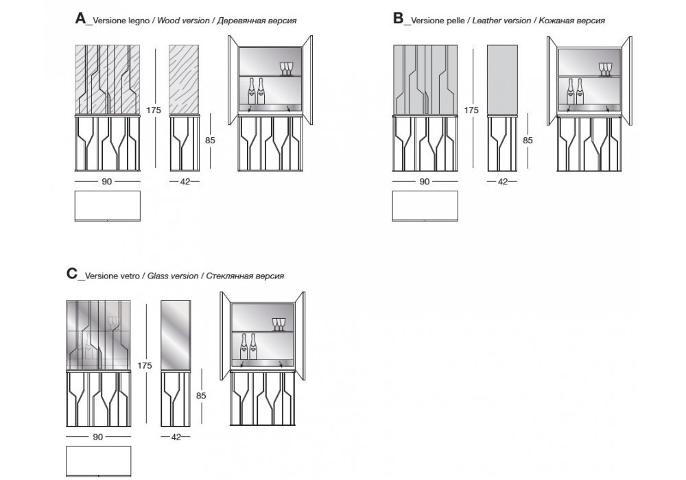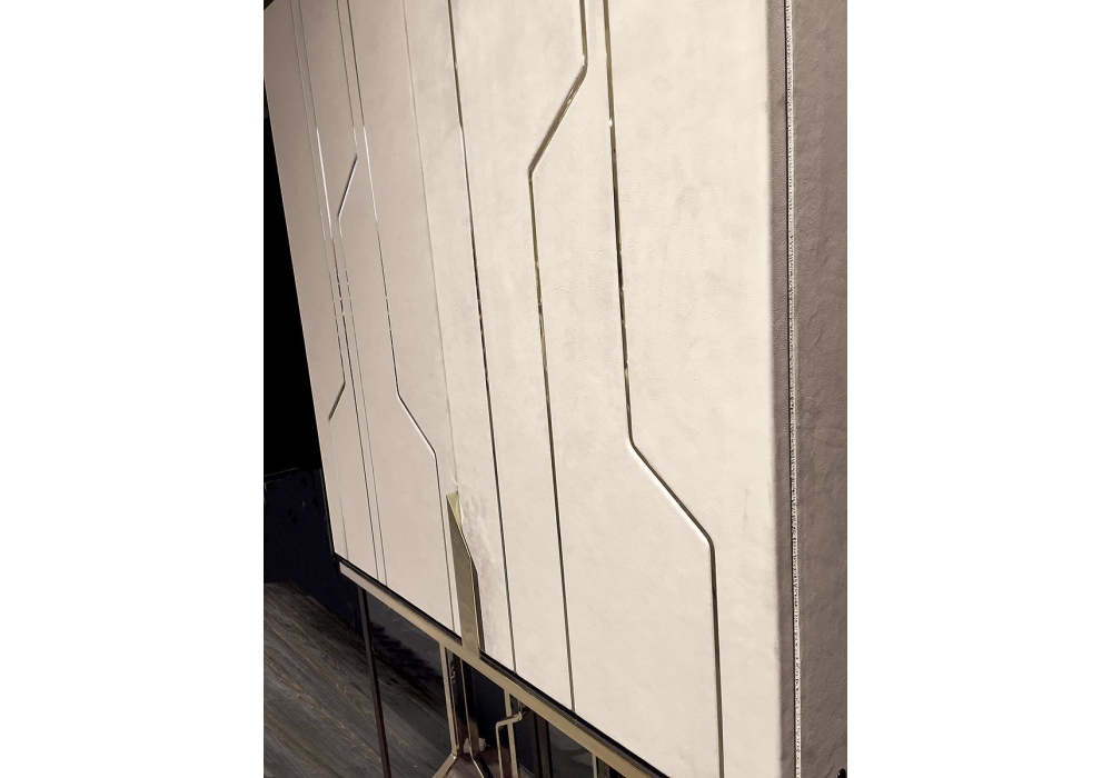 Ginza Bar conçu par Alessandro La Spada pour Longhi est un meuble bar avec base en métal brillant ou mat, structure en bois brillant, en verre StopSol ou recouvert de cuir avec des profils métalliques façonnés assortis à la base. A l'intérieur se trouve un tiroir avec une façade en métal et une étagère centrale en verre trempé. Éclairage avec bandes LED dimmables avec allumage tactile. Poignée métallique coordonnée.