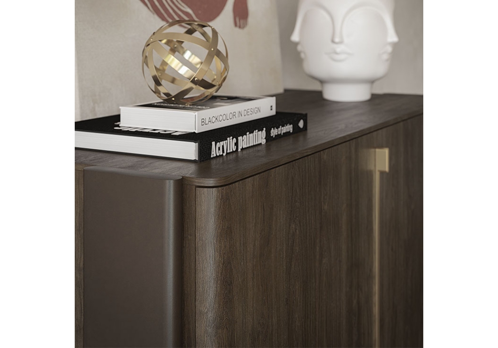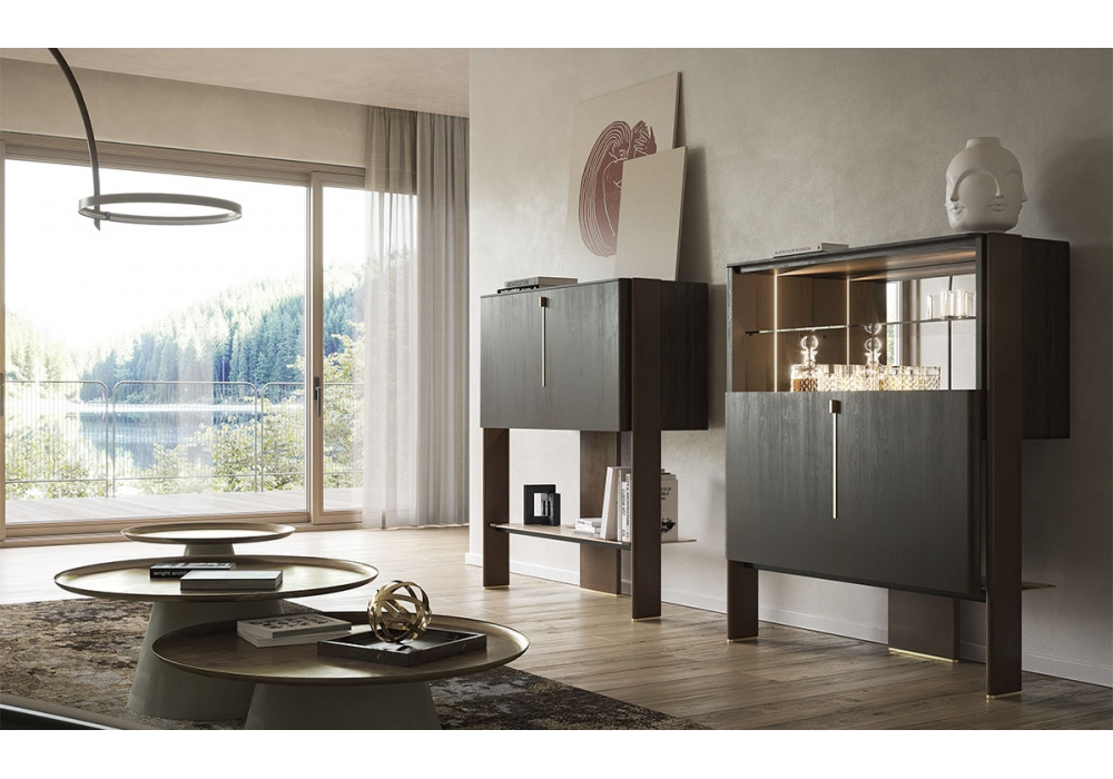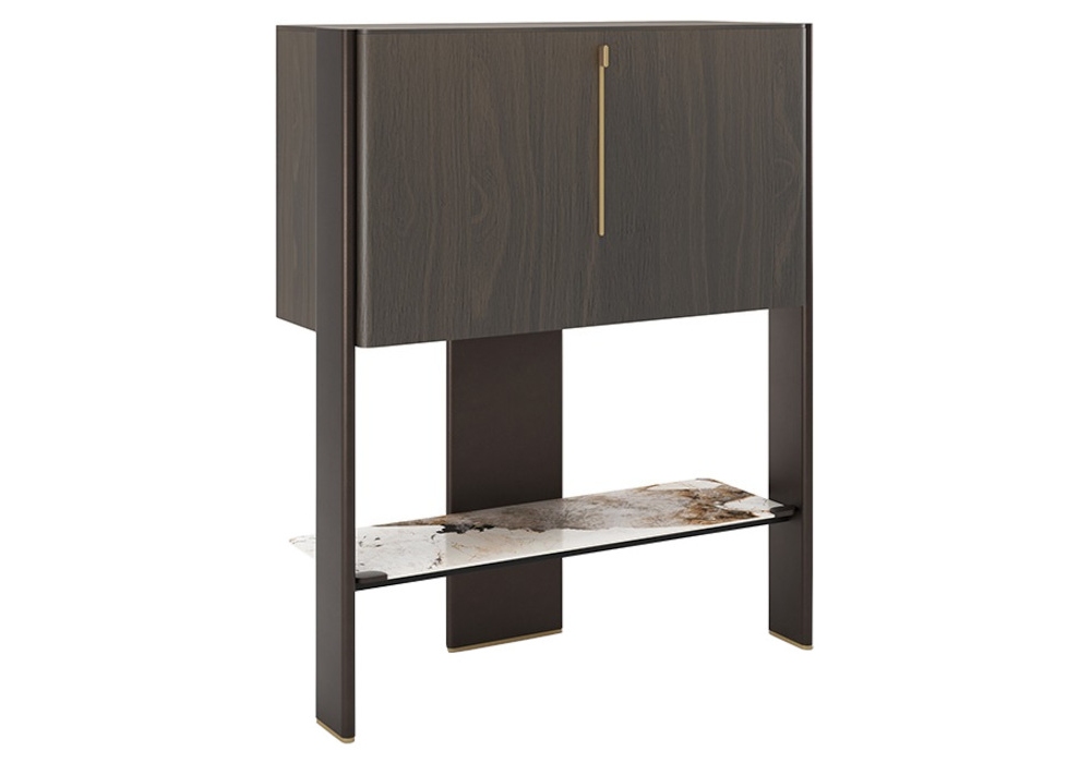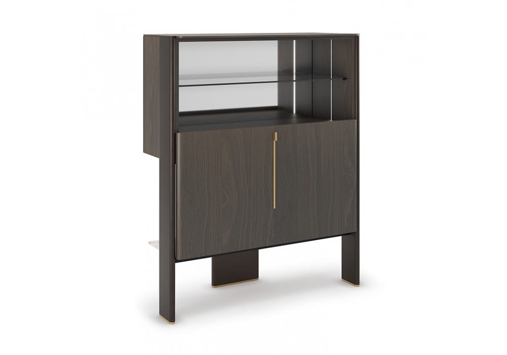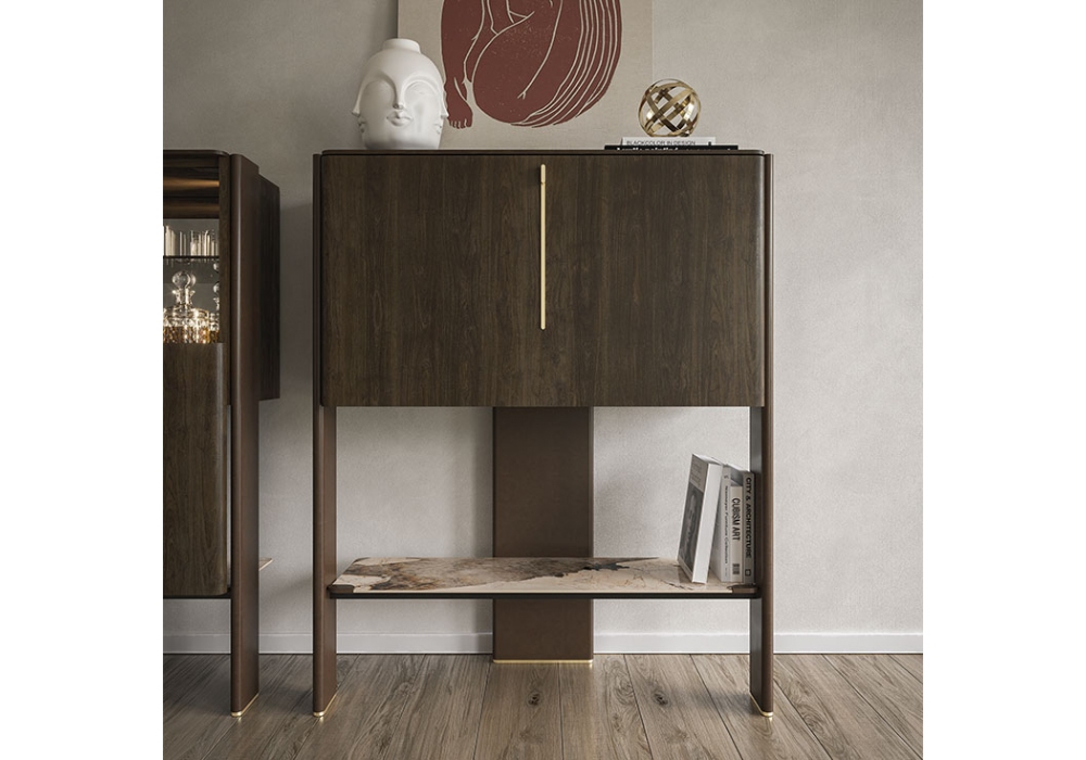 Cremona conçu par Tosca Design pour Cattelan Italia est un meuble bar avec porte coulissante en noyer Canaletto ou chêne brûlé. Structure en bois verni gaufré bronze et noyer Canaletto ou chêne brûlé avec détails en acier verni laiton. Intérieur avec miroir fumé, étagère supérieure en verre fumé et éclairage LED. Étagère inférieure extérieure en céramique Marmi dans les couleurs mates Portoro ou Corcovado.