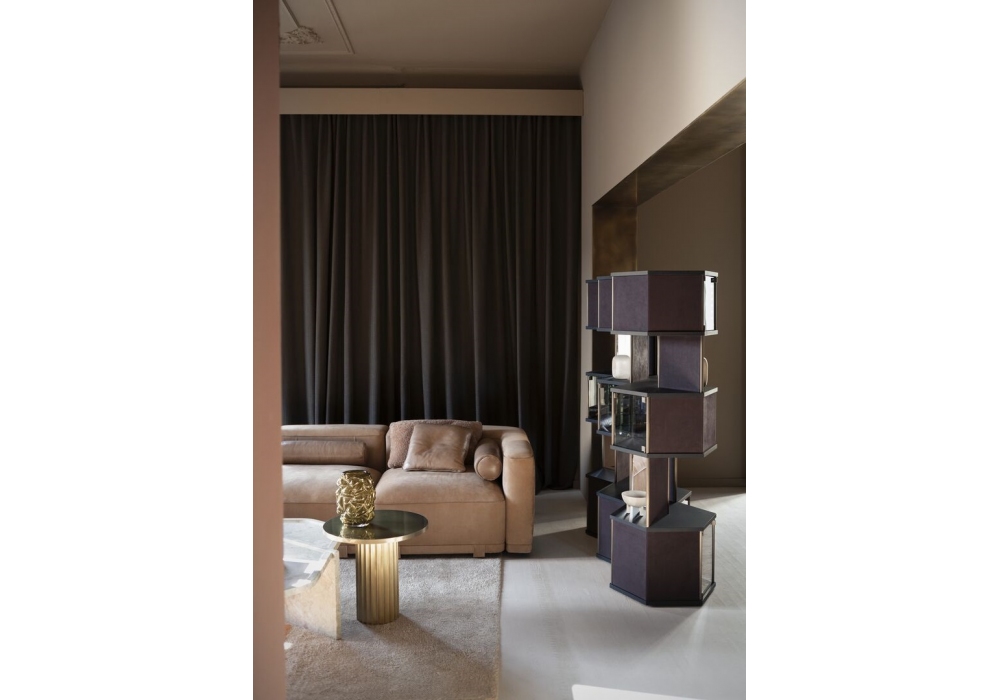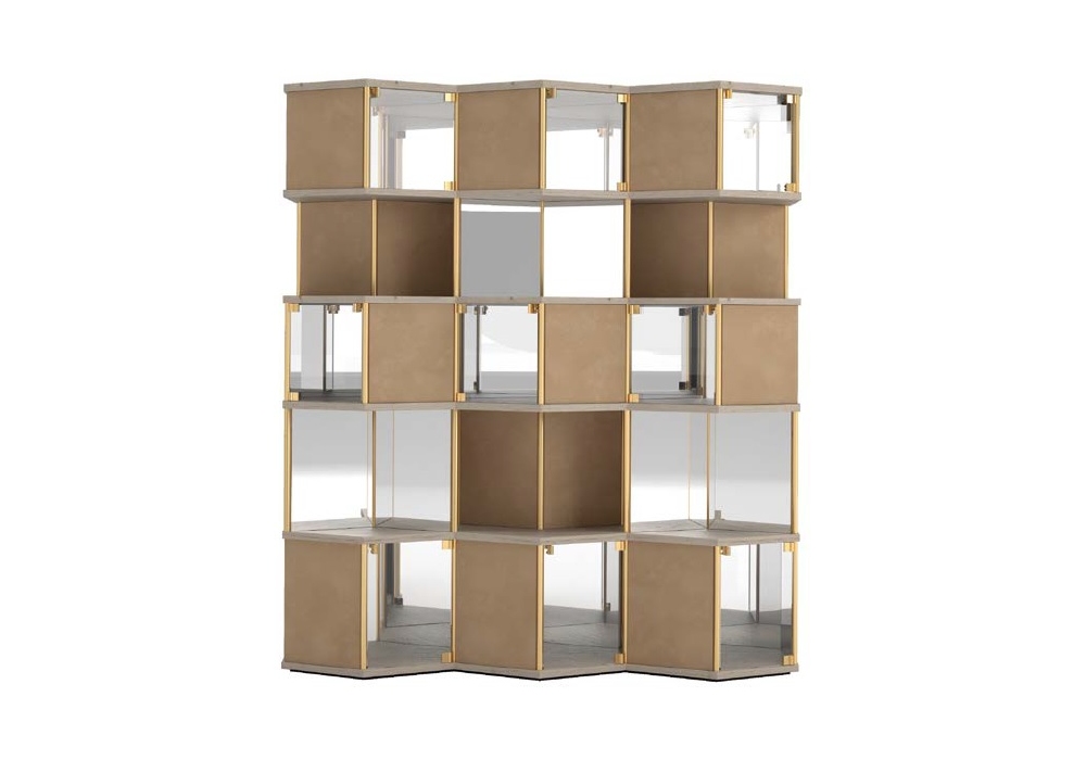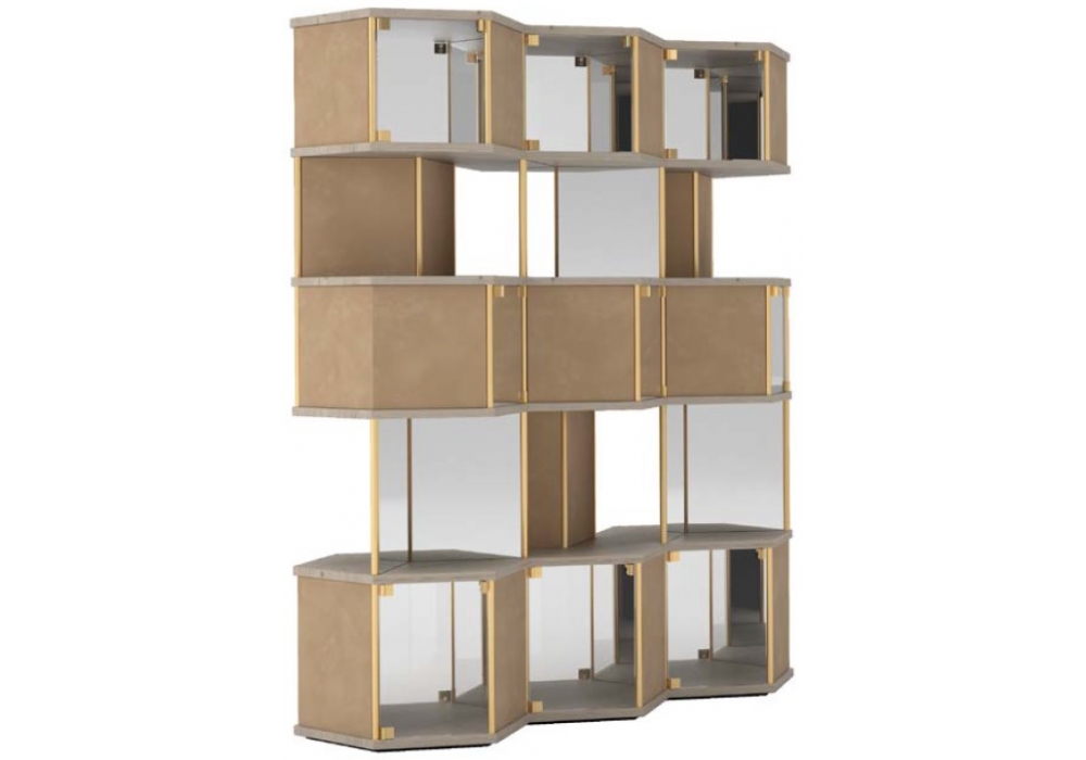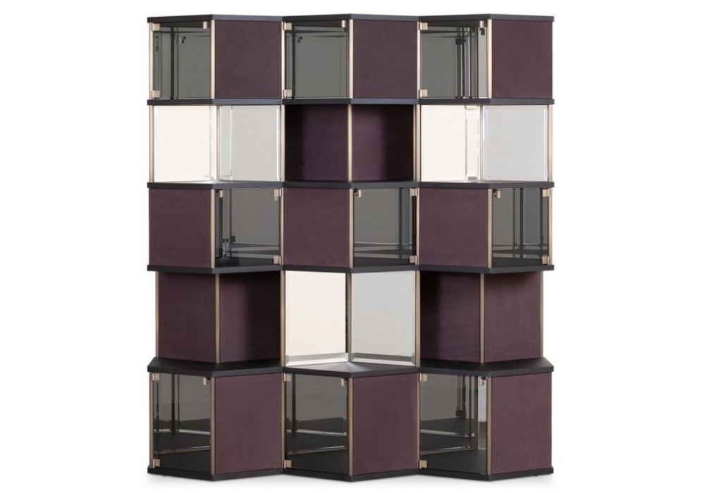 Hive conçu par Pietro Russo pour Baxter est un meuble bar avec structure et étagères en érable. Volets en verre fumé de couleur extra claire avec détails en laiton satiné ou en laiton bruni. Parties latérales et séparateurs en MDF et stratifié recouverts de cuir et miroir.