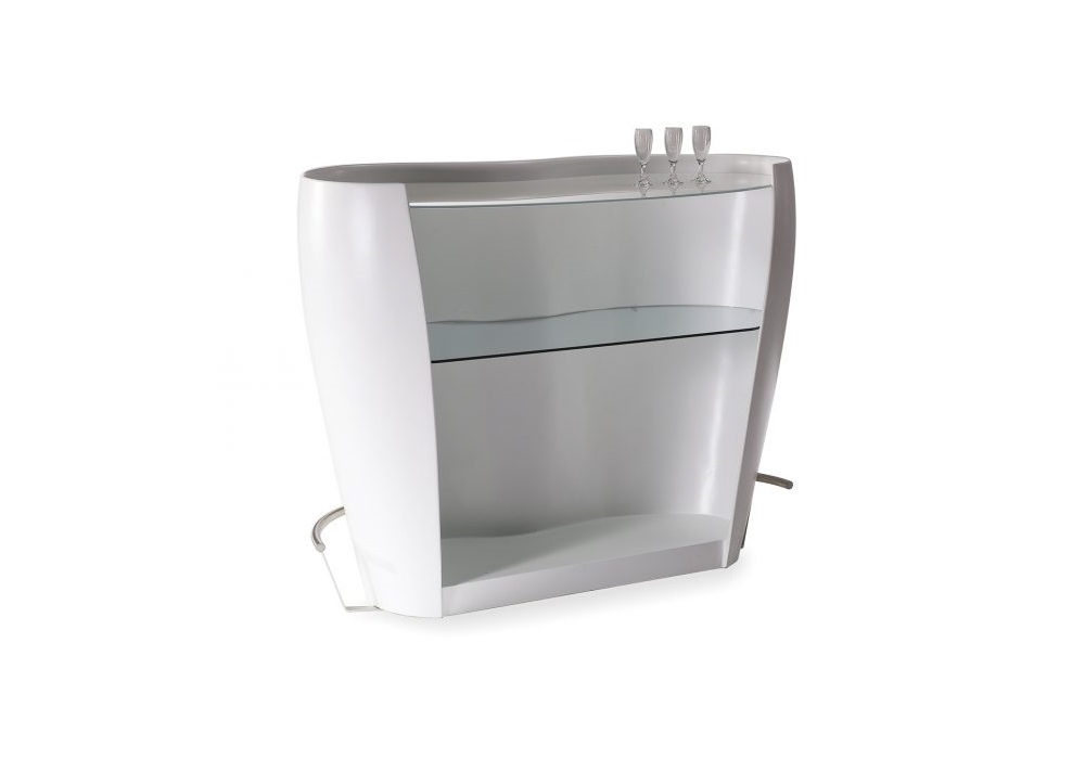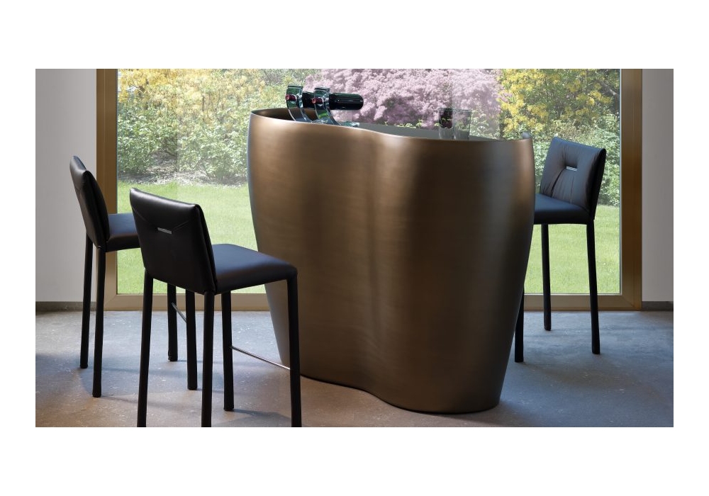 Coco De Mer conçu par Riccardo Lucatello pour Reflex Angelo est un bar/comptoir profilé en finition laquée mate ou en finition laiton satiné, laiton foncé, titane ou titane foncé. Plateau en verre laqué et étagère en verre transparent. Repose-pieds en acier en option.