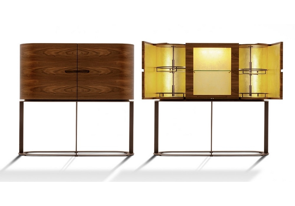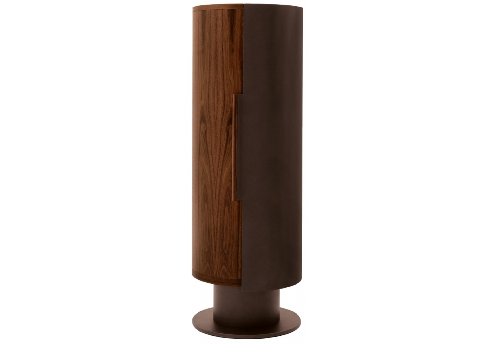 Ino conçu par Chi Wing Lo pour Giorgetti est un meuble bar à une ou deux portes en noyer canaletto. Dans la version cylindrique, la structure de la porte est en métal courbé. La partie interne est disponible en deux versions : Sycomore frisè teint blanc ou décor à la feuille d'or. Le meuble est fourni en standard avec des plateaux tournants en métal peint bronze : ceux-ci sont réglables en hauteur et ont des plateaux en verre et des lumières LED. La base est en métal peint bronze.