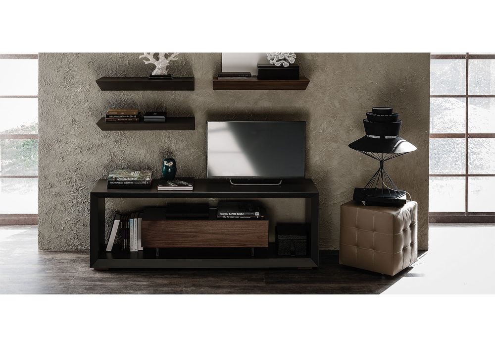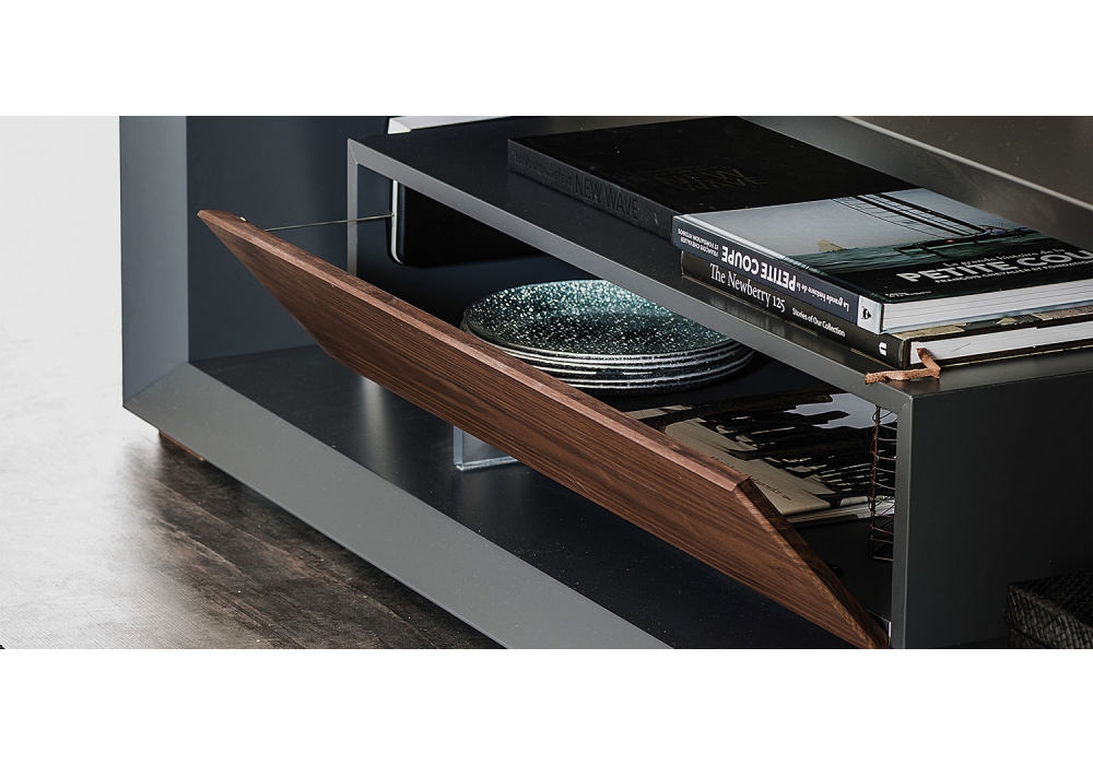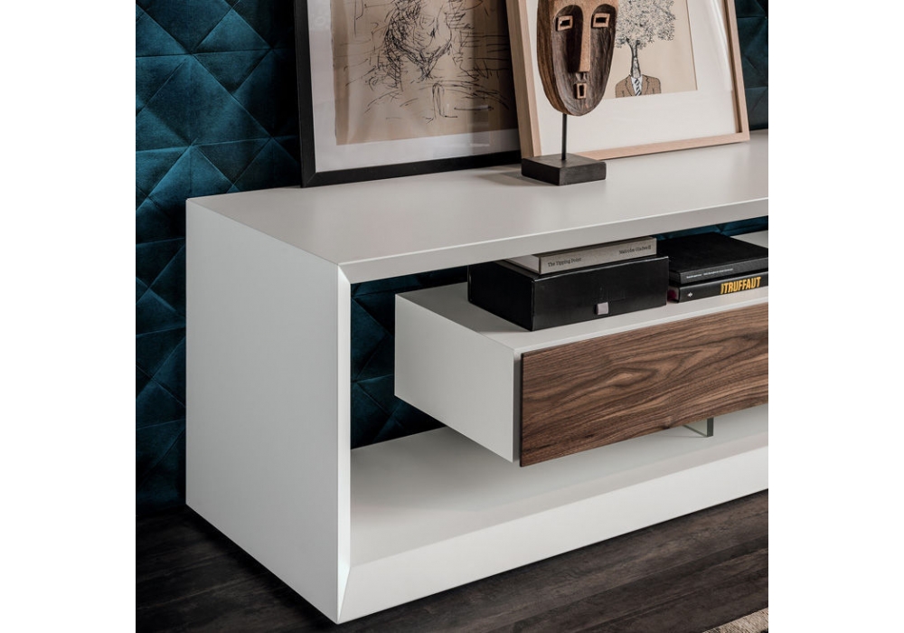 Boxer conçu par Paolo Cattelan pour Cattelan Italia est un meuble TV avec structure et tiroirs en gaufré blanc ou graphite. Portes en noyer Canaletto.