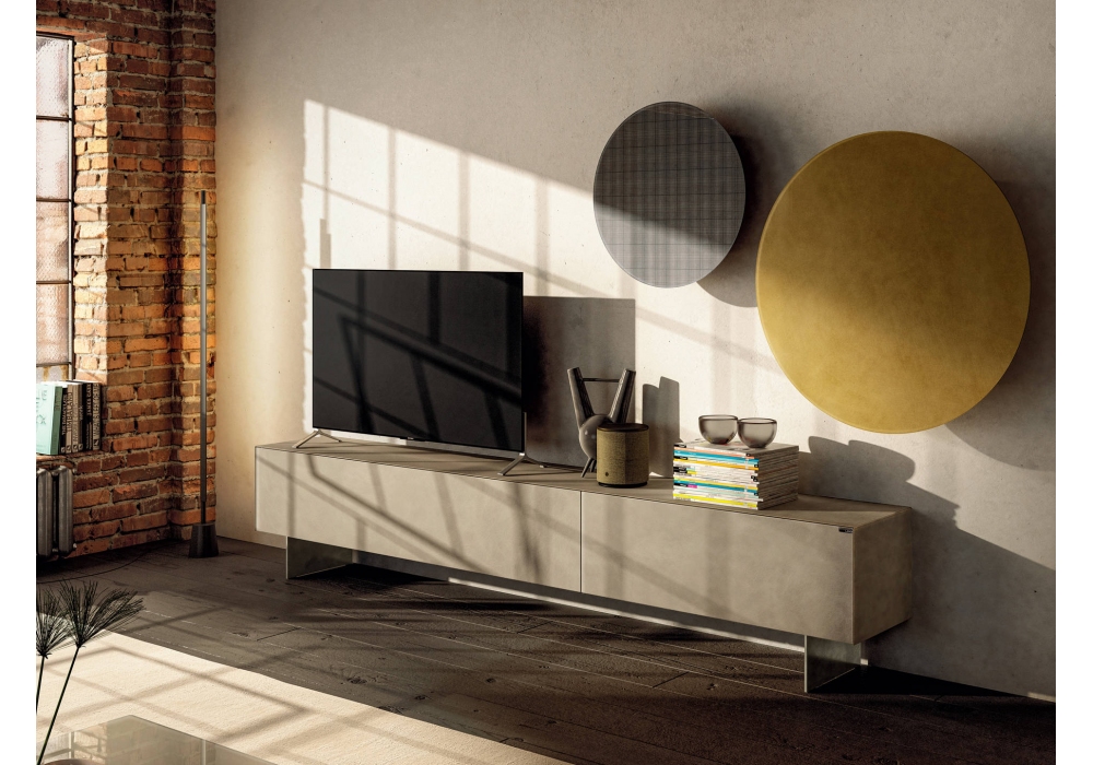 36e8 conçu par Daniele Lago est un meuble TV personnalisable en taille, forme et couleur. Il est disponible en verre ou en xglass.