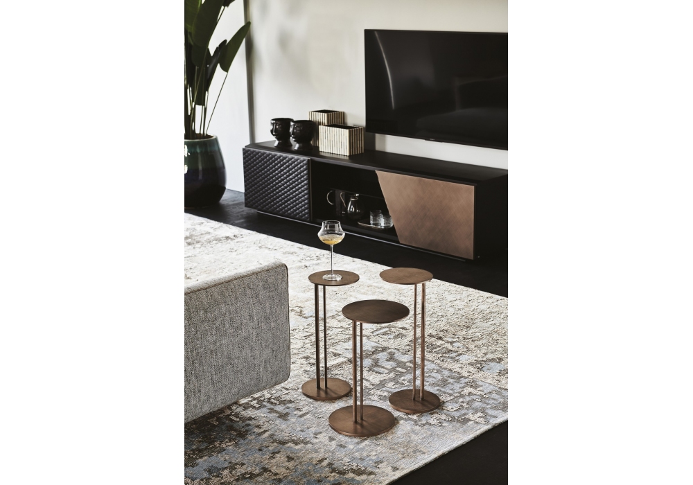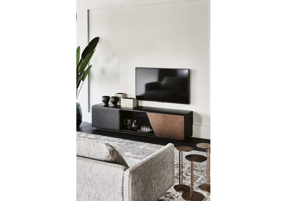 Aston TV conçu par STC Studio pour Cattelan Italia est un meuble porte-TV avec structure en bois laqué gaufré et base en acier. Porte gauche avec revêtement matelassé en cuir ou éco-cuir, porte droite en bois avec détails en chrome noir. Étagères internes en verre fumé.