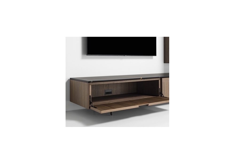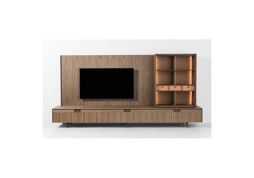 Matics TV conçu par Gabriele & Oscar Buratti pour Porada est un système modulaire équipé d'un meuble TV, d'éléments de rangement et de panneaux. Intérieur équipé d'un éclairage LED intégré, dimmable via télécommande ou APP, étagères et compartiment ouvert, avec possibilité d'insérer max. trois tiroirs avec façades en bois ou Cuoio. Base en métal finition étain et plateau en bois ou marbre.